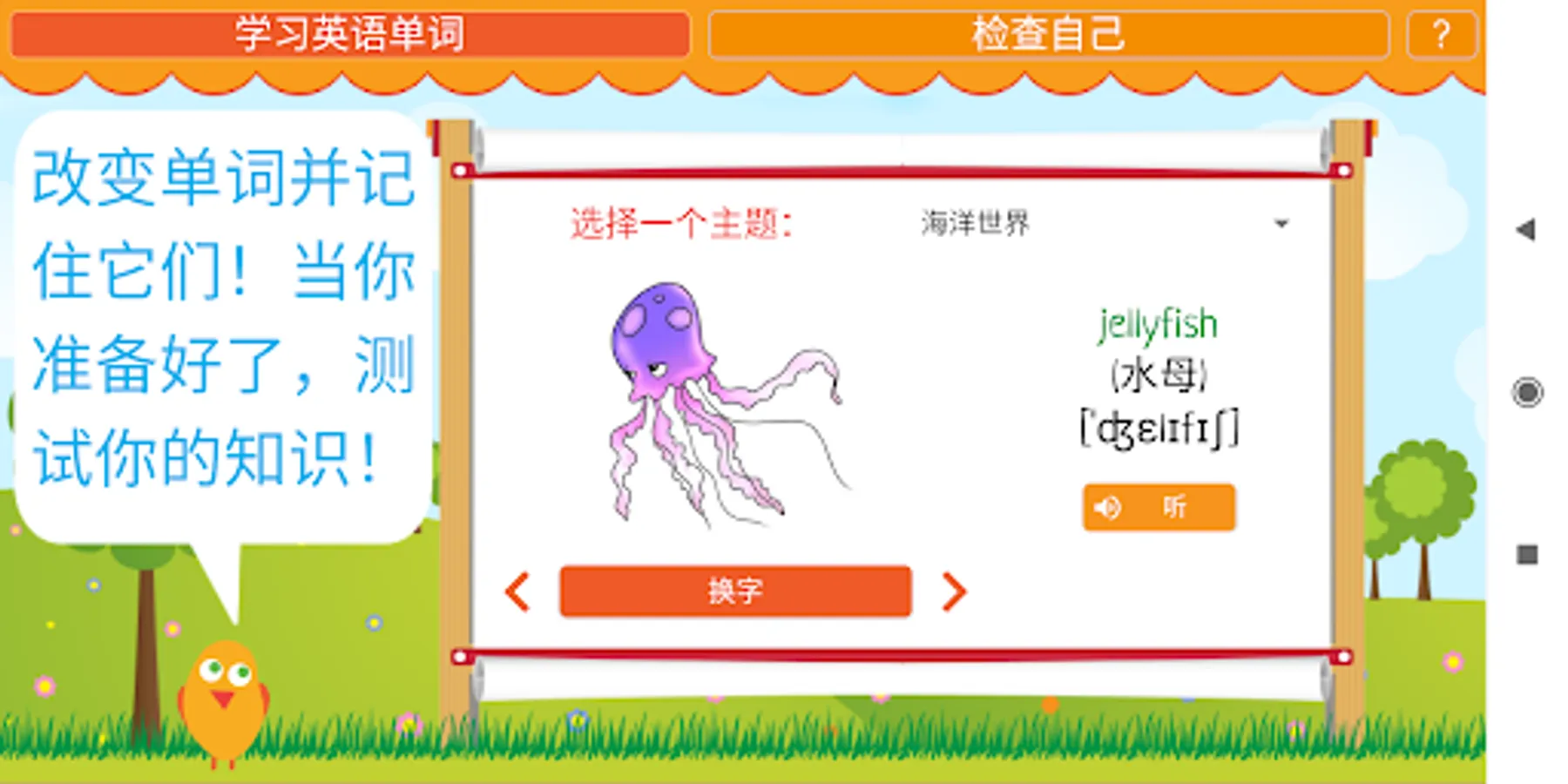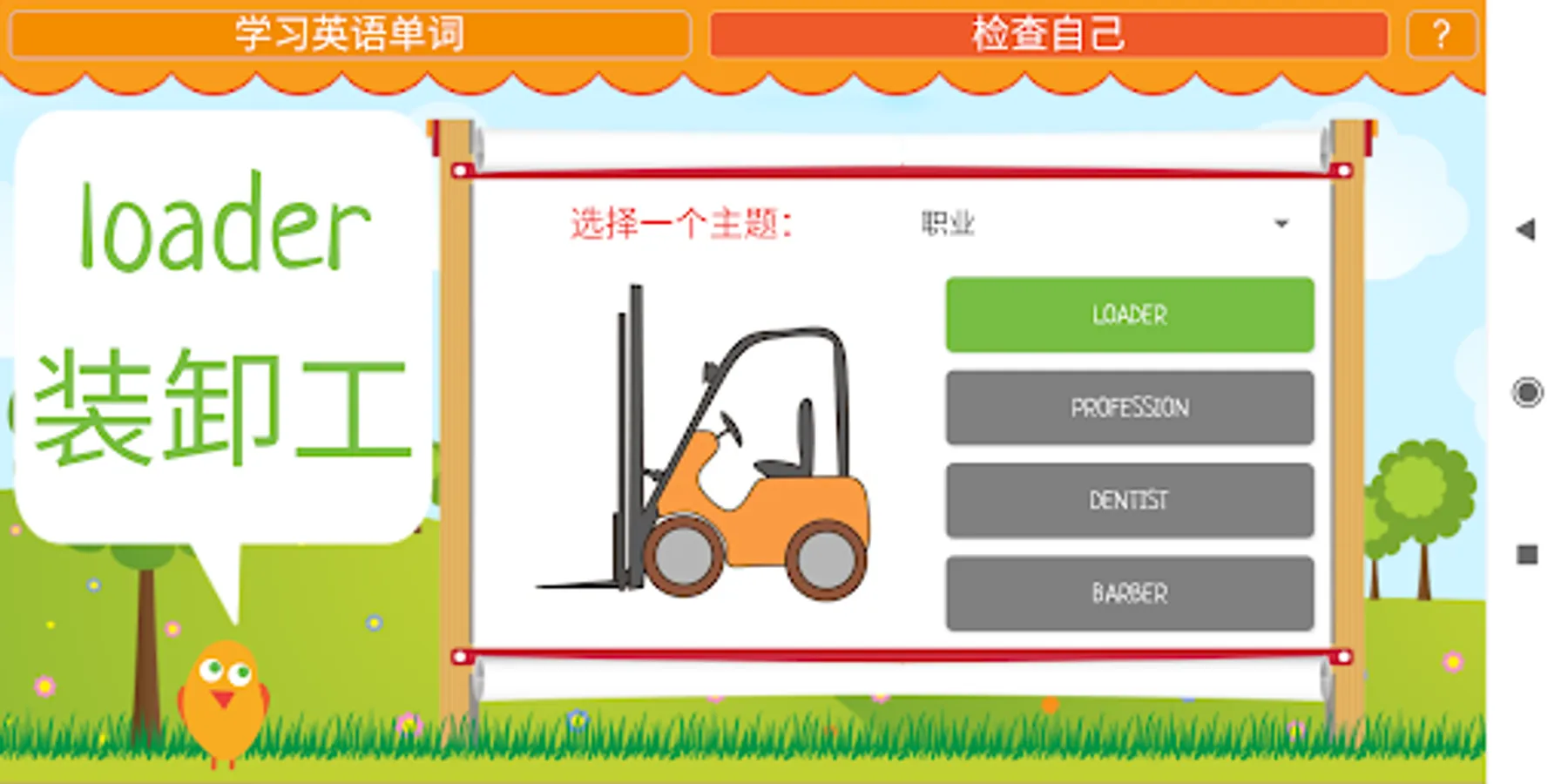 Learning English is easy - all words are divided into topics and learning them can be very convenient because the same type of information is remembered faster. First, you need to choose a topic in the "Learn English Words" mode. After the child has reviewed the words of a topic, they can practice in the knowledge test mode to better memorize the words. To do this, you need to select the "check yourself" mode in the menu and complete tasks that require memorizing words, looking at pictures.