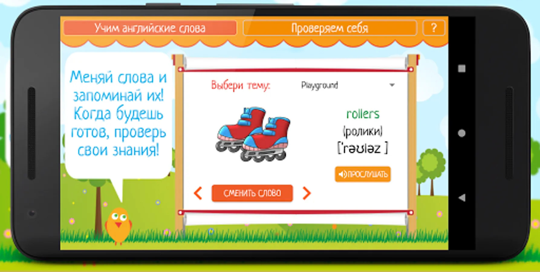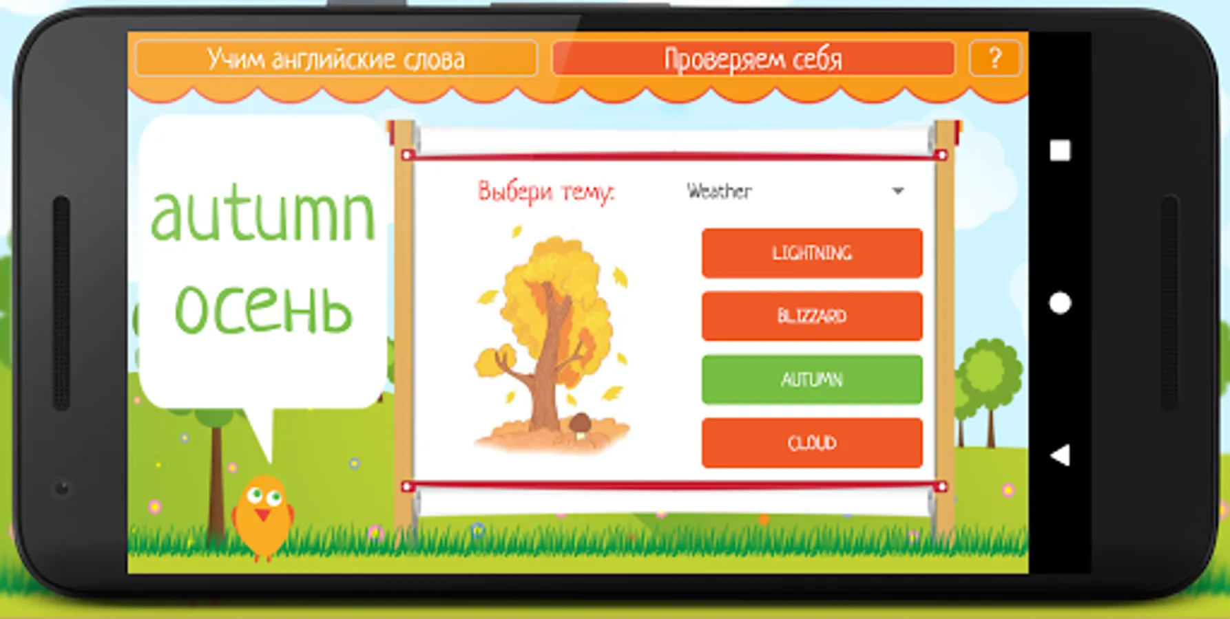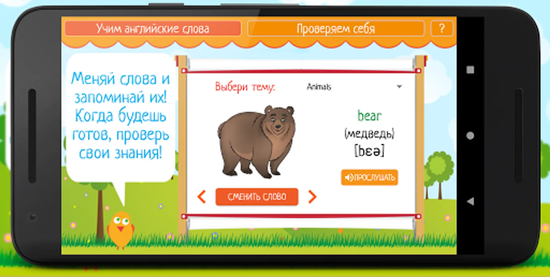 Learning English is easy - all words are divided into topics, it will be very convenient to learn them, because information of the same type is memorized faster. First you need to select a topic in the "Learn English words" mode. After the child has scanned the words on a specific topic, he can practice in the knowledge test mode to better remember them. To do this, in the menu, you must select the "Check yourself" mode and complete tasks in which you need to remember a word, looking at the picture.