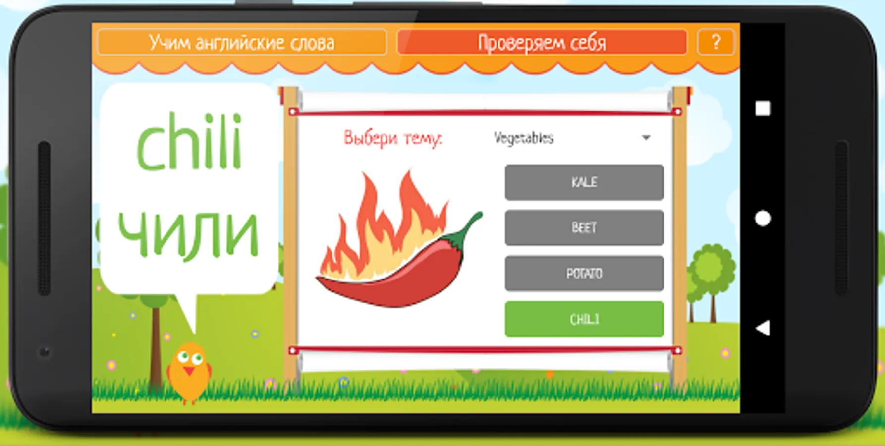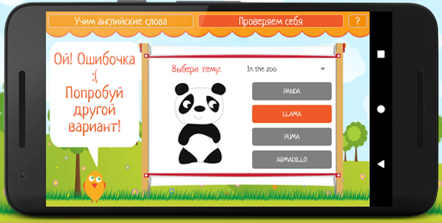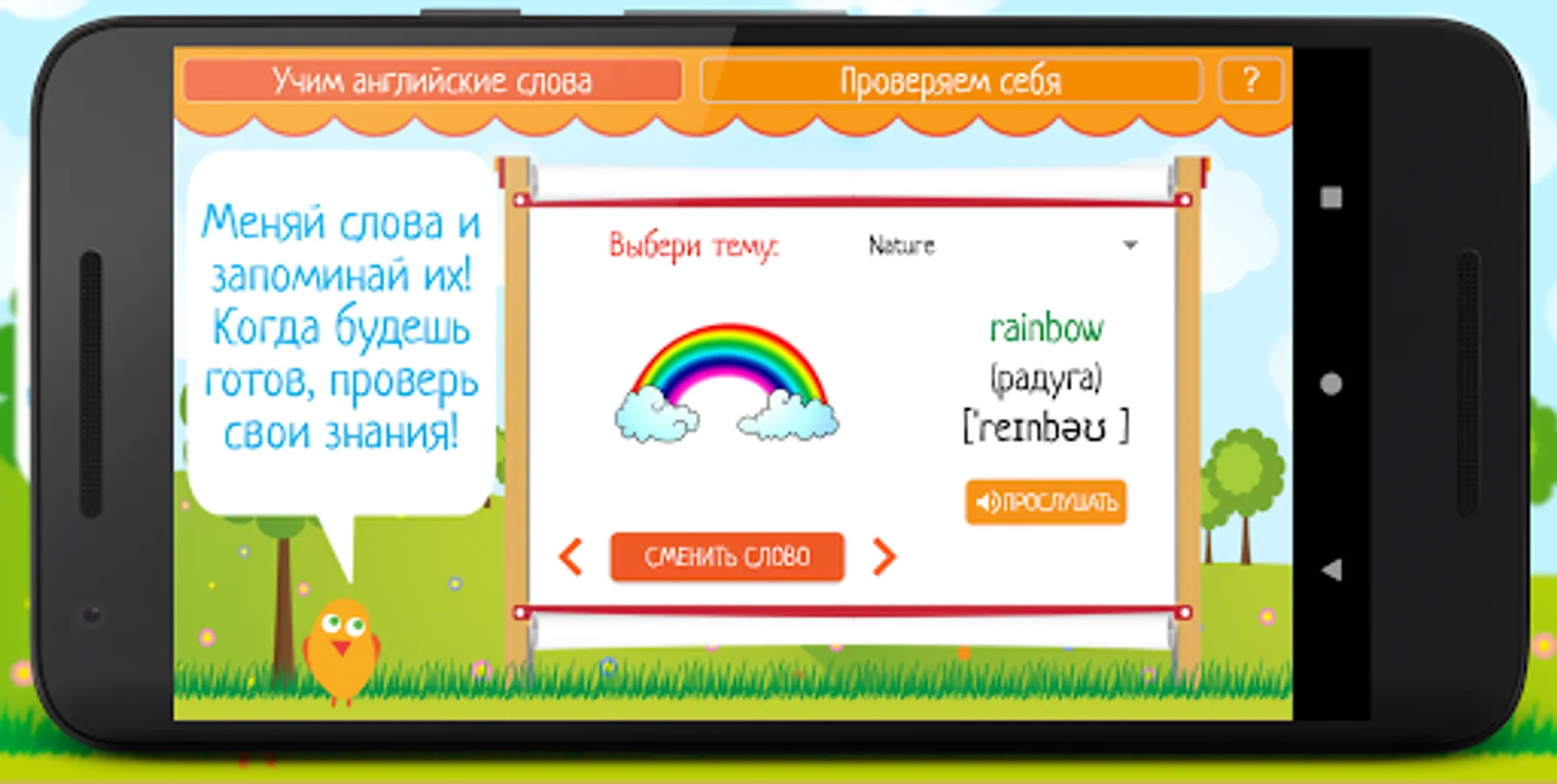 Learning English is easy - all words are divided into topics, it will be very convenient to learn them, because information of the same type is memorized faster. First you need to select a topic in the "Learn English words" mode. After the child has scanned the words on a specific topic, he can practice in the knowledge test mode to better remember them. To do this, in the menu, you must select the "Check yourself" mode and complete tasks in which you need to remember a word, looking at the picture.