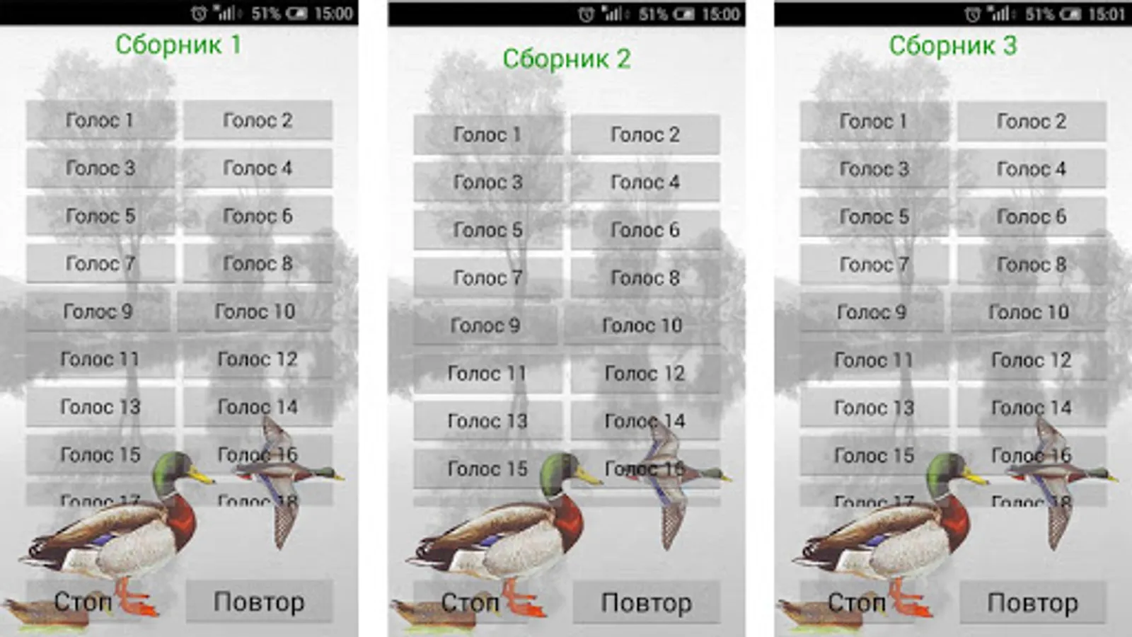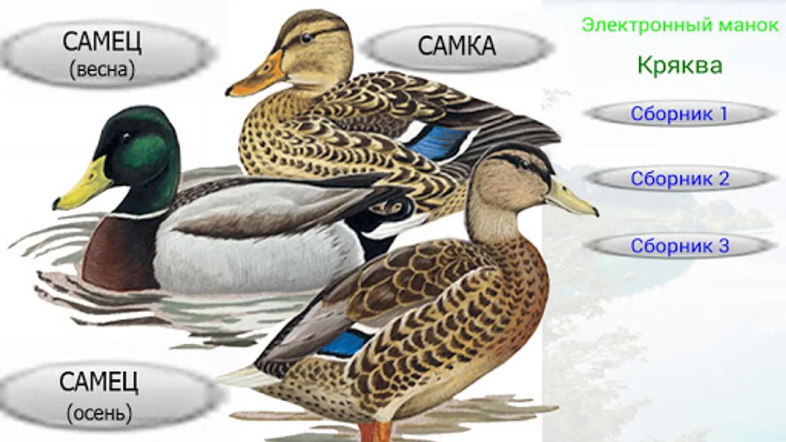 The application implements the reproduction of 60 voices of a river duck mallard, including a duet with a whistle whistle, a pintail, and others.