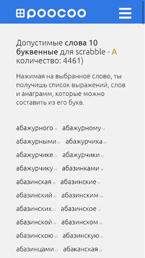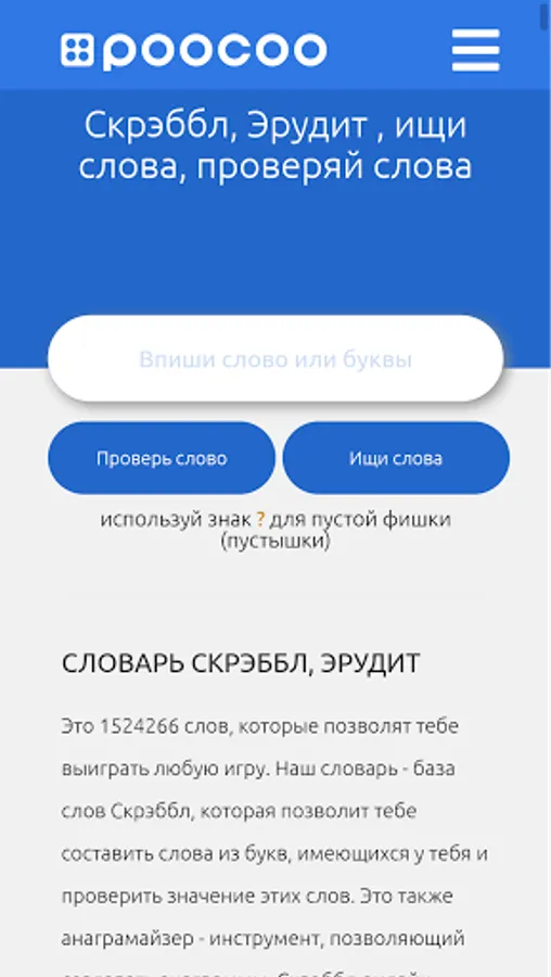 These are 1,524,266 words that will let you win any game. Our dictionary is a Scrabble word base that will allow you to compose words from the letters you have and check the meaning of these words. It is also an anagramizer - a tool that allows you to create anagrams. Scrabble online.