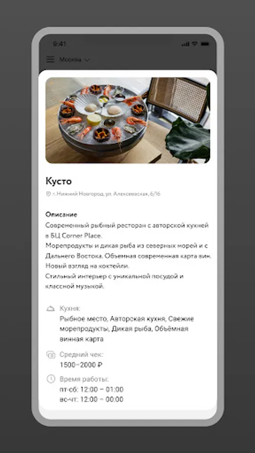 - detailed information about each restaurant: menu, cuisine, average bill, opening hours, contacts, address