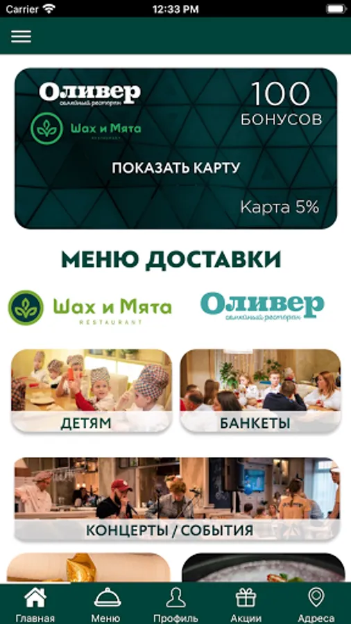 All your favorite dishes from restaurants "Shah and Mint" and "Oliver" in your smartphone. Order them for delivery, and our couriers will arrive just in time to you.