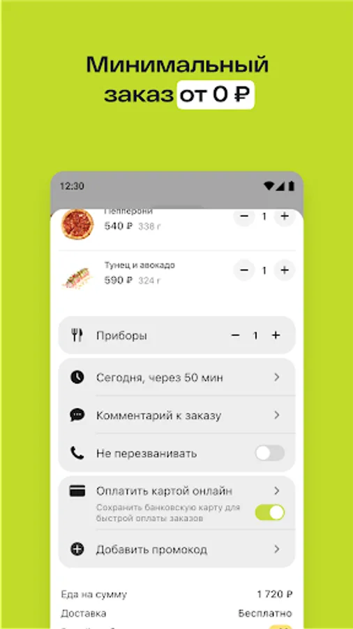 We deliver quickly, the minimum order is from 0₽. Through push notifications, we inform you when the courier arrives.