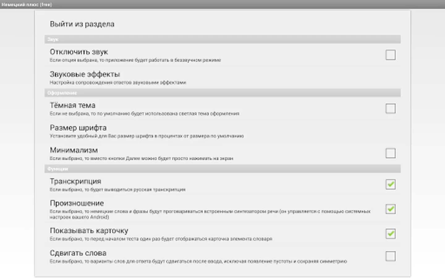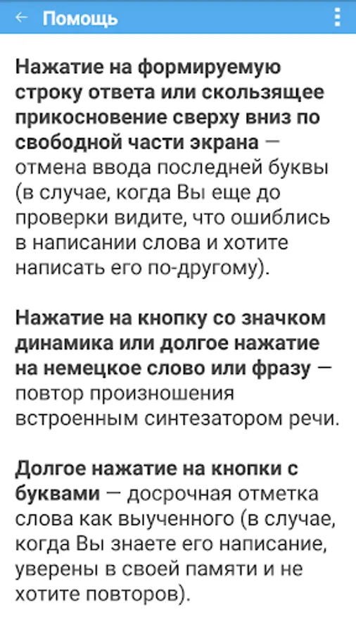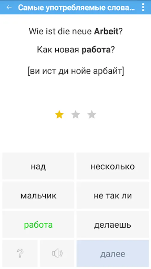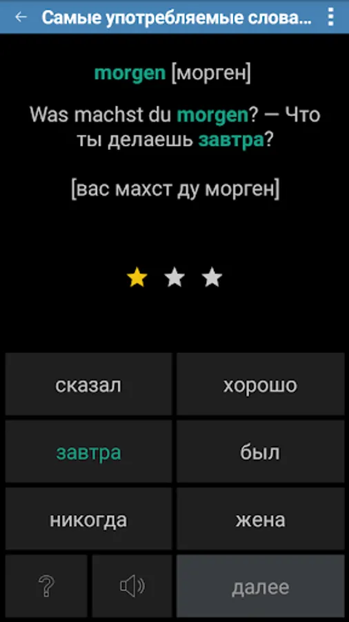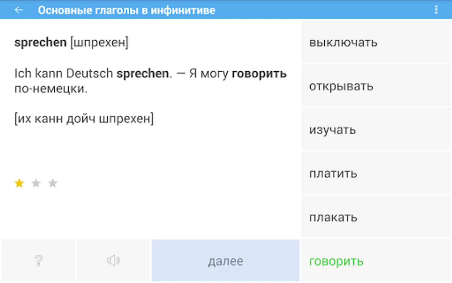 All training is based on tasks, during which the user receives gold stars. With a set of 3 stars, the dictionary element is considered learned. At the same time, German words and phrases are pronounced by the built-in speech synthesizer (controlled by the system settings of your Android).