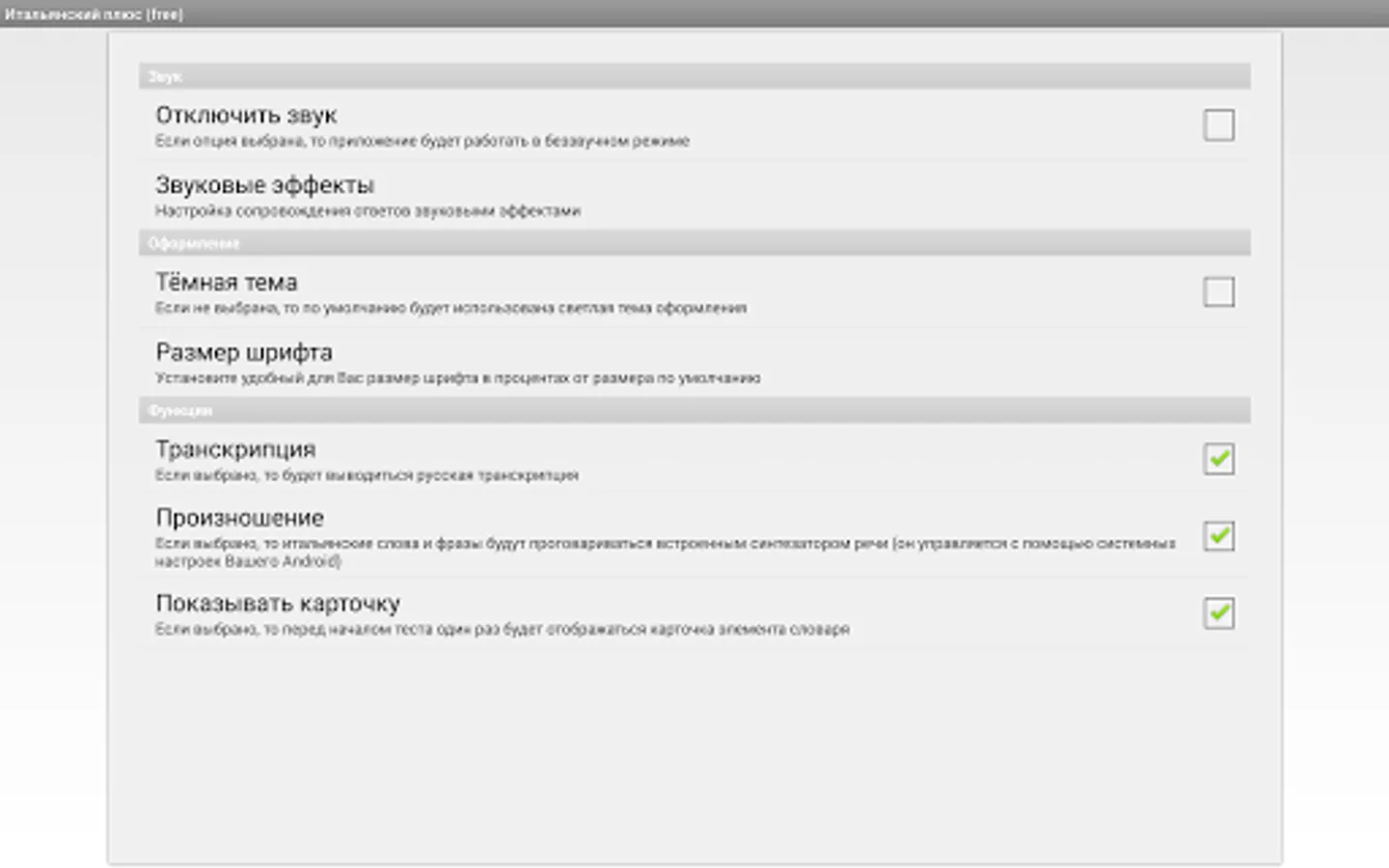 All training is based on tasks, during which the user receives gold stars. With a set of 3 stars, the dictionary element is considered learned. At the same time, Italian words and phrases are pronounced by the built-in speech synthesizer (controlled by the system settings of your Android).