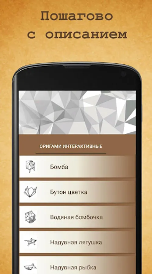 The application is dedicated to origami - the ancient art of folding figures from paper and sheets. Here you will find origami folding patterns. We hope that this resource will be useful for you.