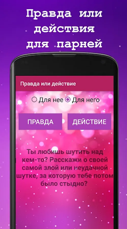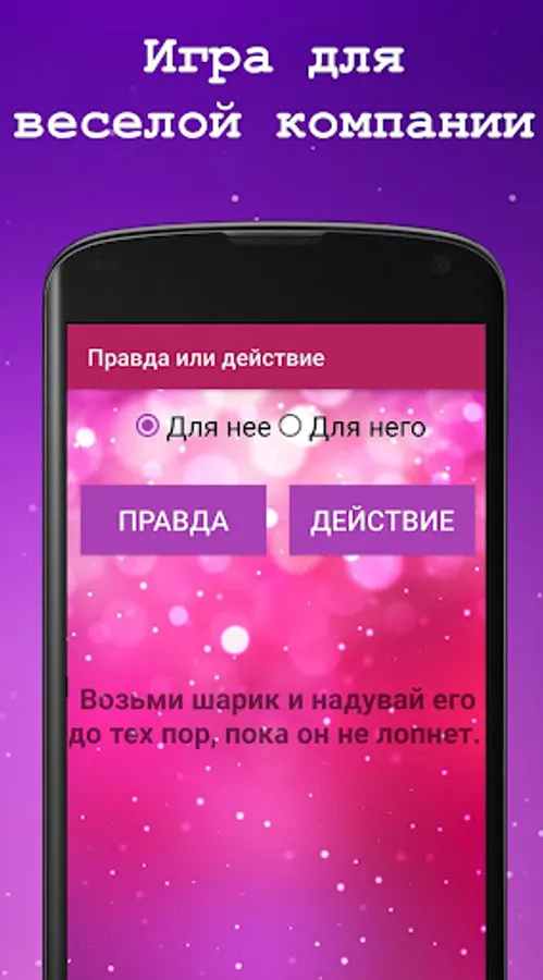 There is such an addictive and interesting game called Truth or Dare. A game for parties. " You can play it with a large company for great fun and make friends. This application can be played together with a girl in order to make her fall in love with you. Assignments and questions for the game. You can also play with a large company, ask questions or actions for the enemy to perform.