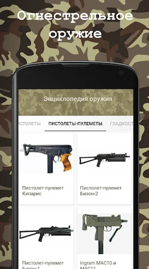 Encyclopedia of firearms. In this application you will find complete information about any type of firearms and small arms, not only of Russian models but also of foreign manufacturers. Rifles, carbines, pistols, revolvers, smoothbore weapons, submachine guns (pp) and much more you will find in this application.