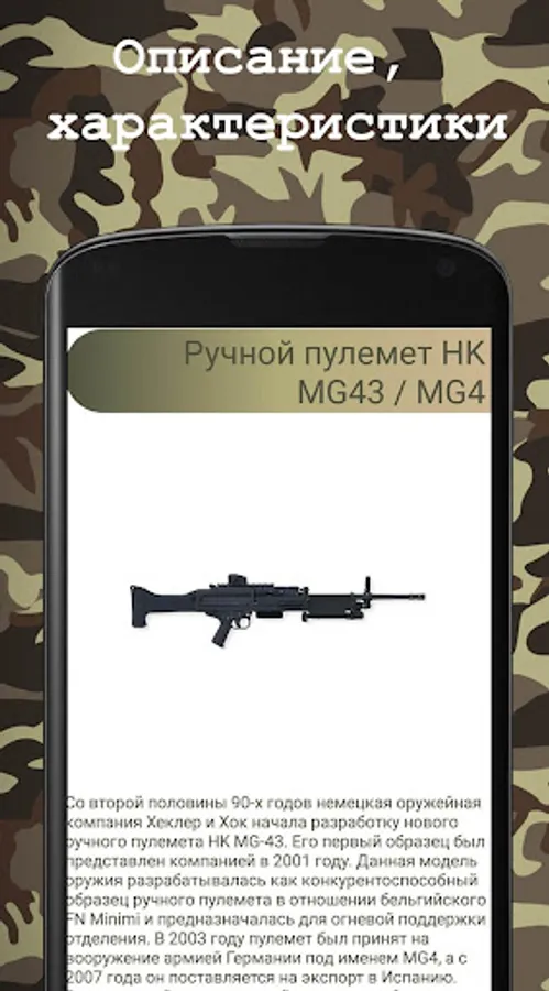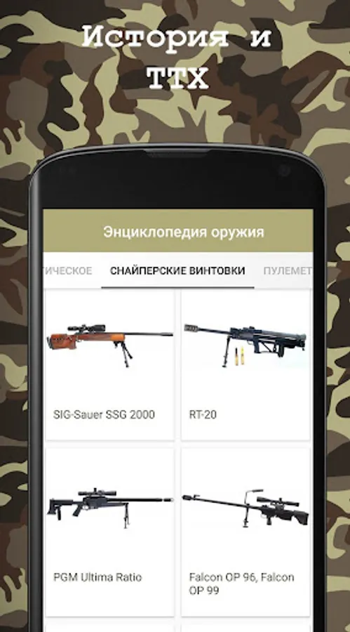 Firearms from around the world were collected, description, performance characteristics, photos and history. Immerse yourself in a fascinating knowledge of firearms with our application.