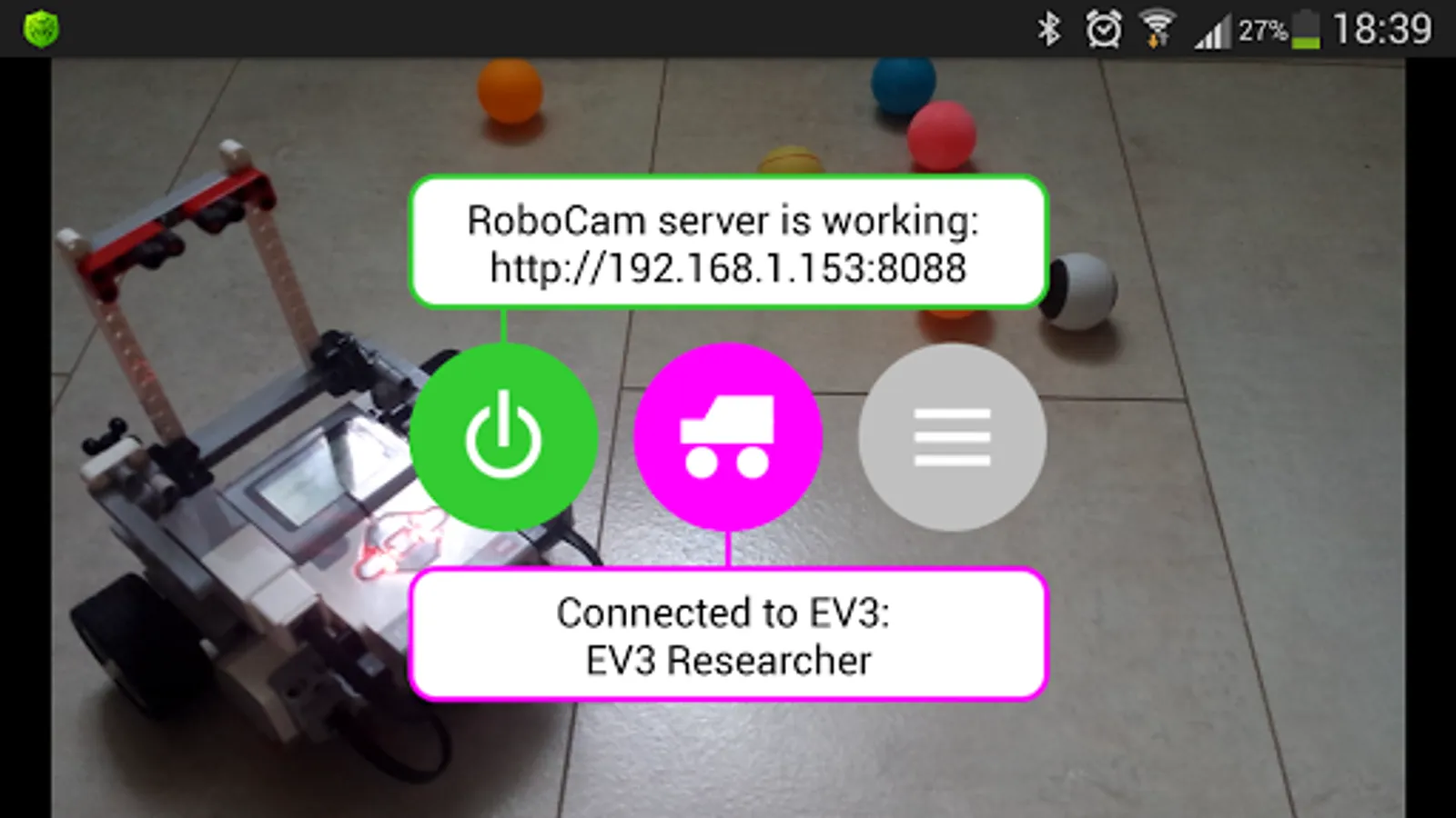 That’s the quick manual on setting the standard connection. Need: EV3 robot, Android-smartphone with the installed RoboCam (hereinafter, Phone 1) and the smartphone or tablet (Android, iOS or Windows) with a modern browser that's supported HTML5 (hereinafter, the Phone 2). Phone 1 is connected to the EV3 via Bluetooth (devices must be pre-paired!). After starting RoboCam server on Phone 1 and connecting Phone 1 and Phone 2 to the same WiFi-router, you can connect to RoboCam server (to Phone 1) via browser (from Phone 2). To do this, you need to write the address into the browser address field that will be shown in RoboCam for example, http://192.168.1.2:8088