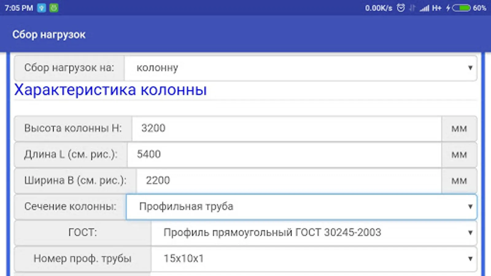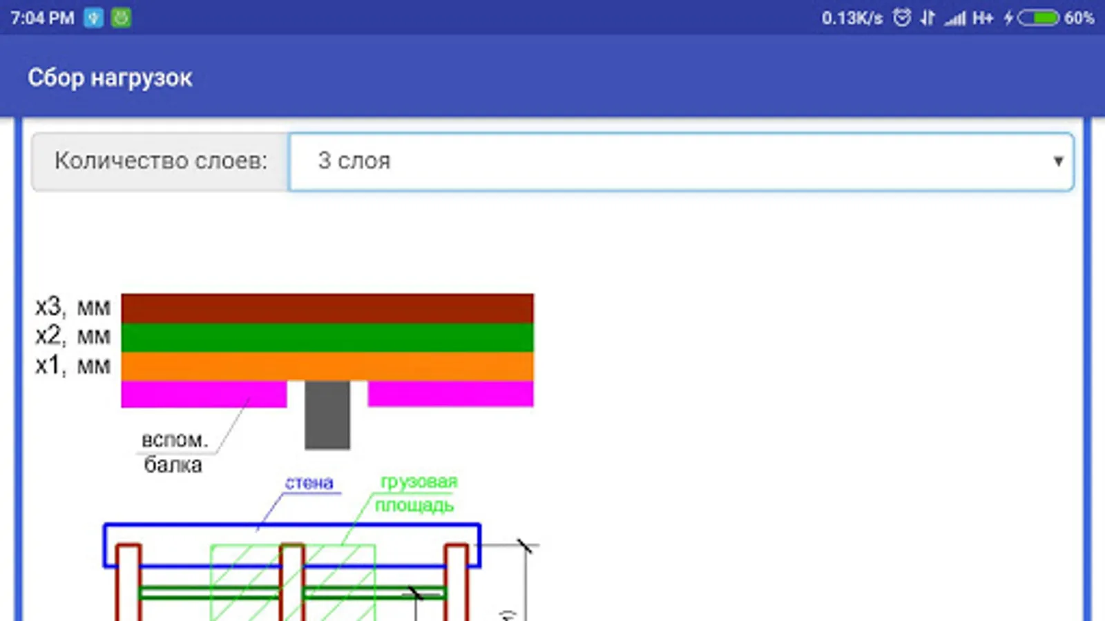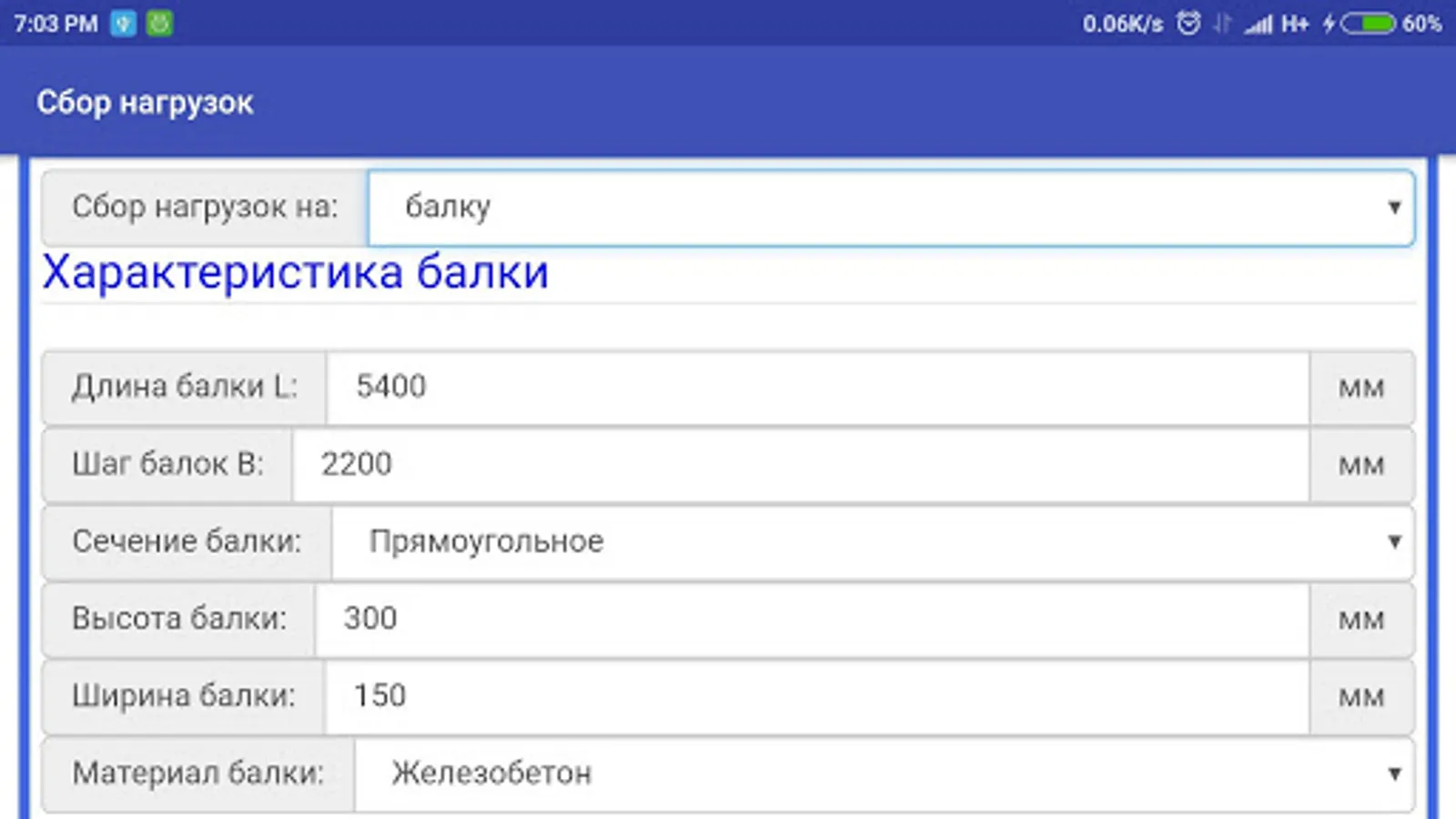 This calculation includes the collection of loads on the floor slab / coatings on various beam cross-section and on a rack / column also different cross sections.