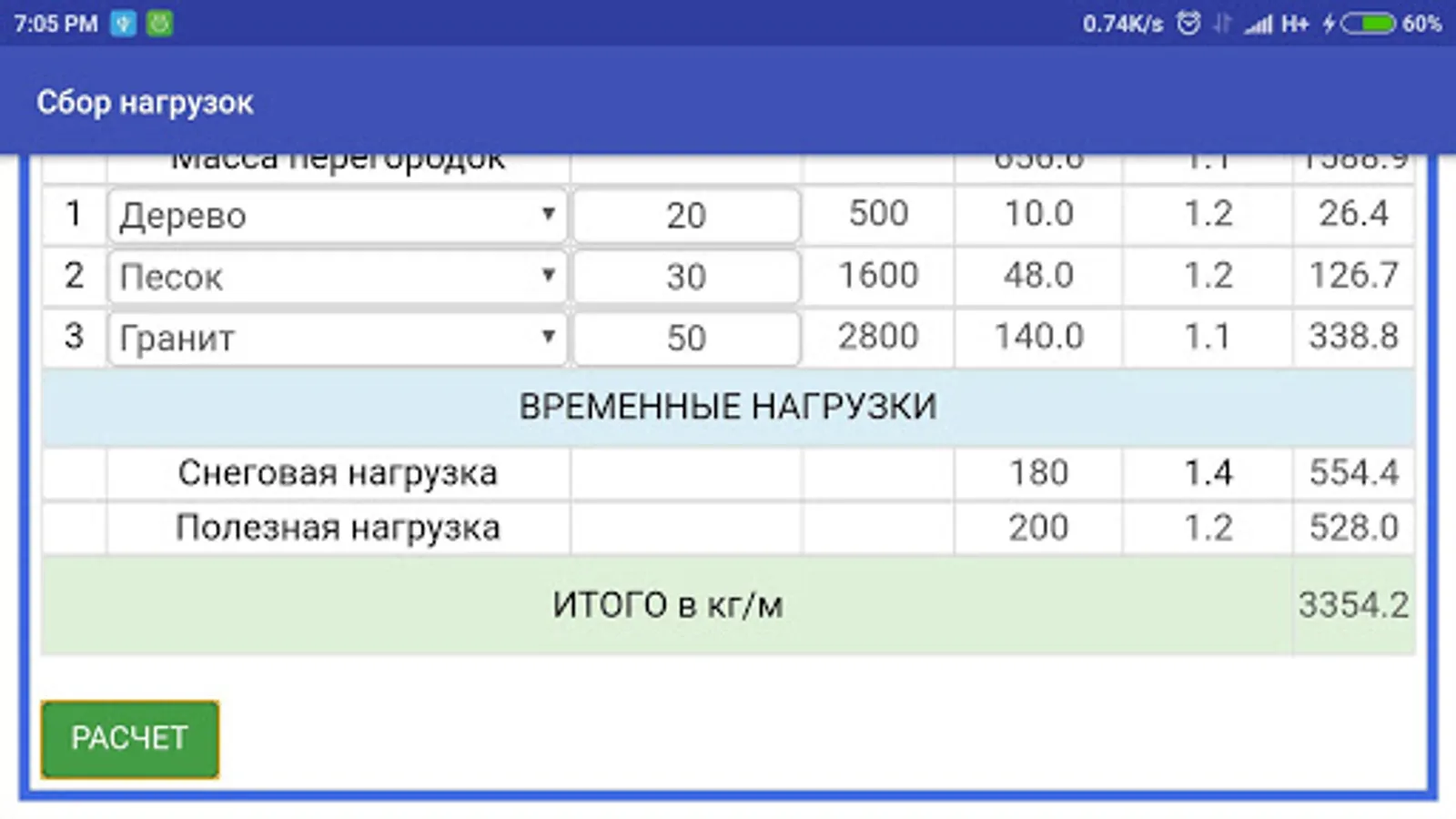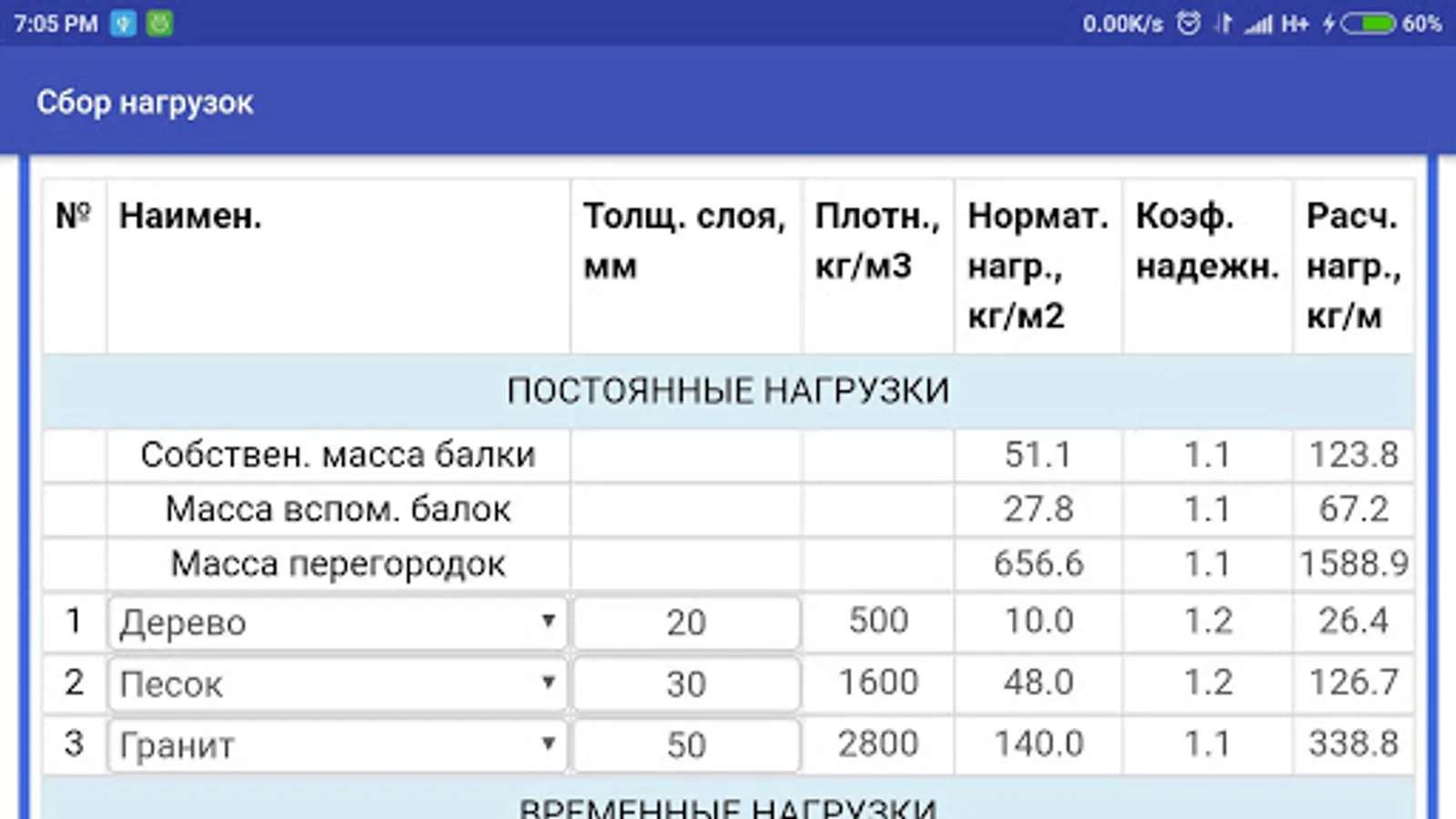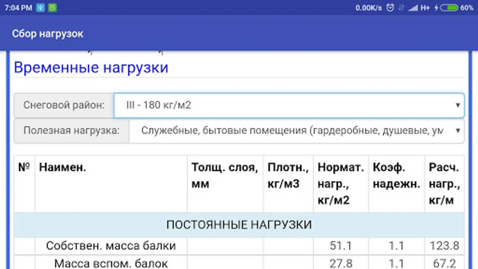 7. As a result, you will give as the total value of your load and painted steps with the corresponding values of coefficients.