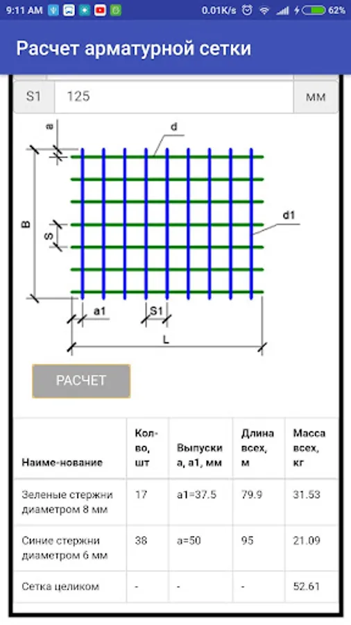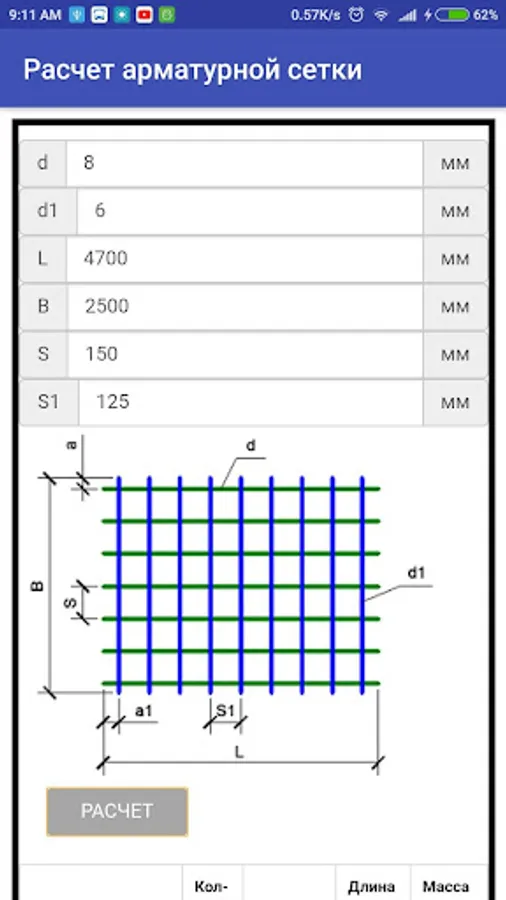 1. Fill in all the fields (diameter of the long and cross bars, the length and width of the mesh, and the bar spacing)