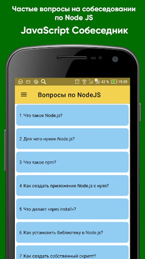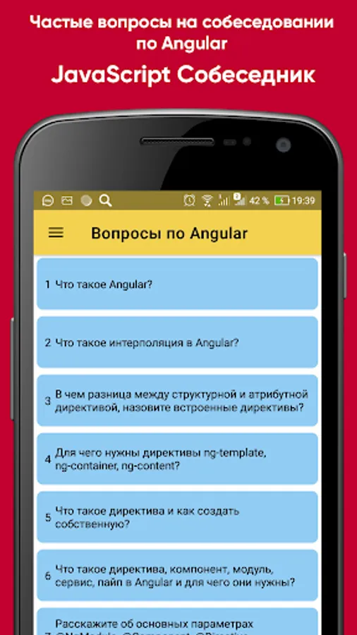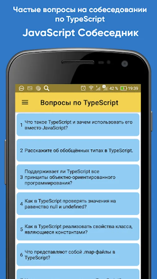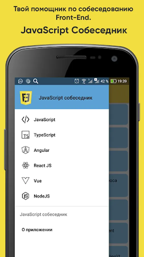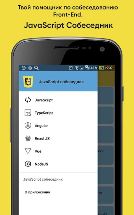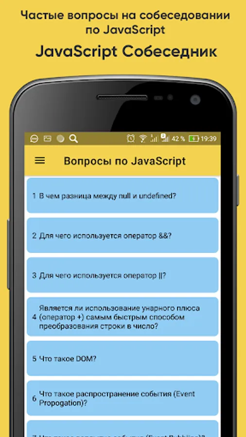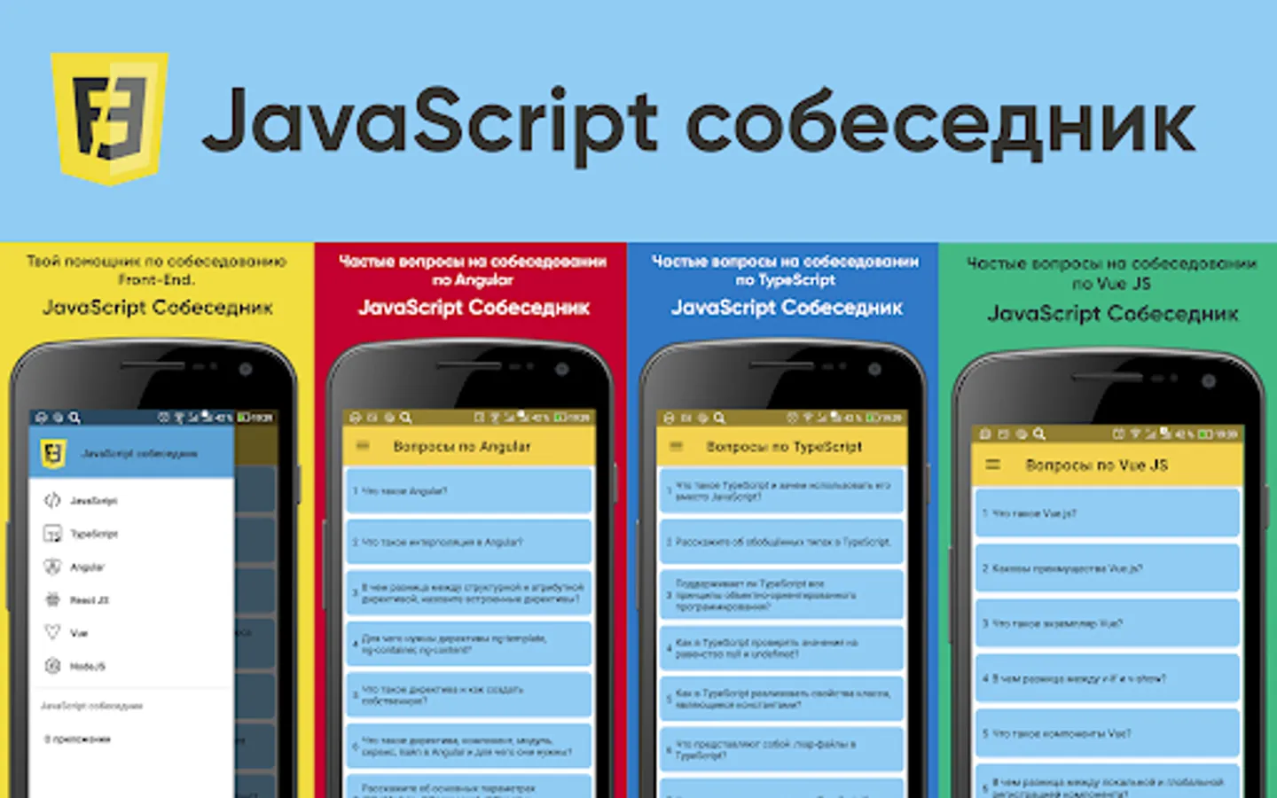 The application contains the most popular questions on JS, Angular, React, Vue, NodeJS, TypeScript. The information was collected from open sources on the Internet and official documentation. Preparing for your interview will be easier with the JavaScript Interviewer app.