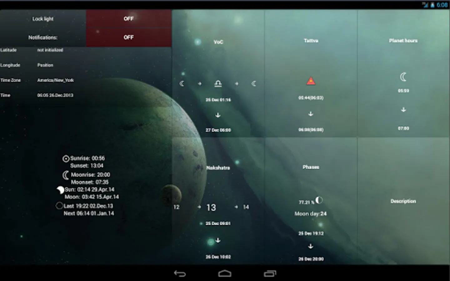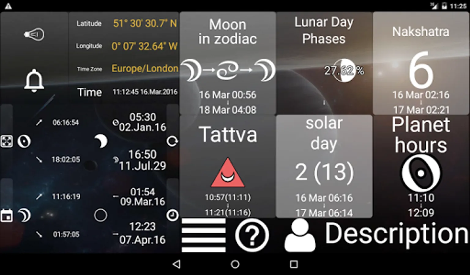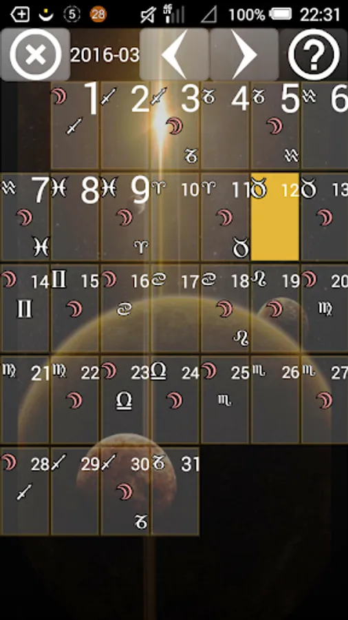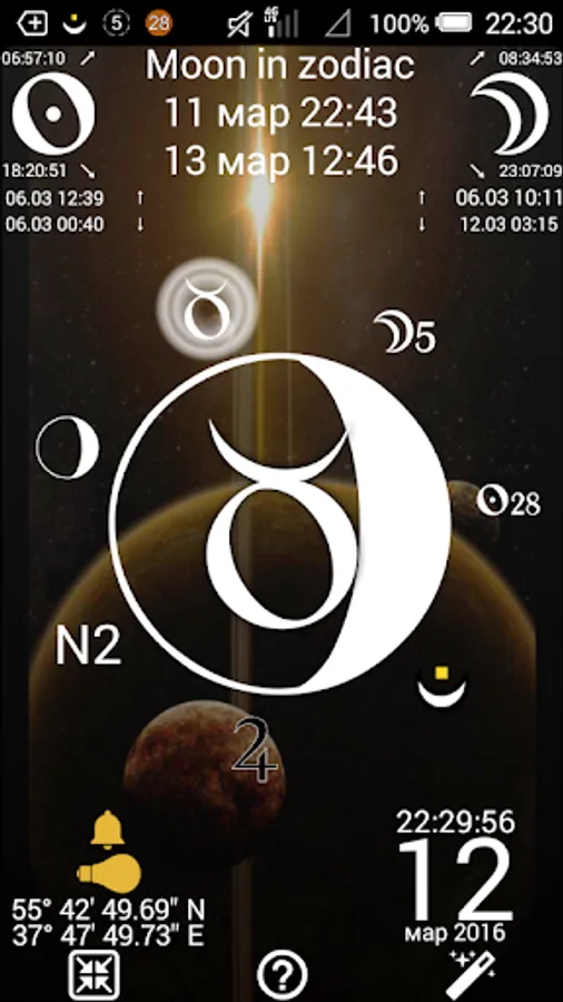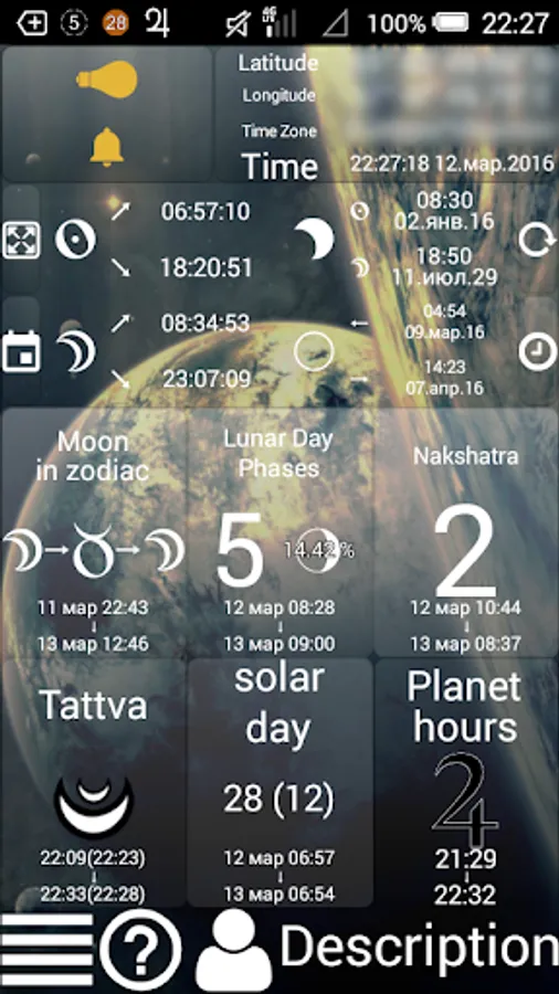 The major feature of Lunar Calendar 2016 is to calculate lunar day for any point of the Earth you want at any time you want. Of course, you can read astrological description and advices for everyday. Now it is supported two variants of lunar days: indian (new day each 12 degrees) and moon rise (new day each moon rise or new moon).