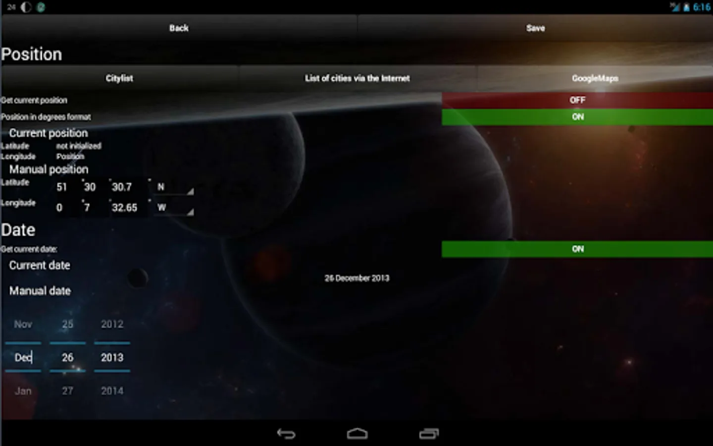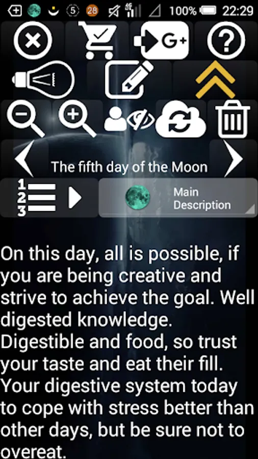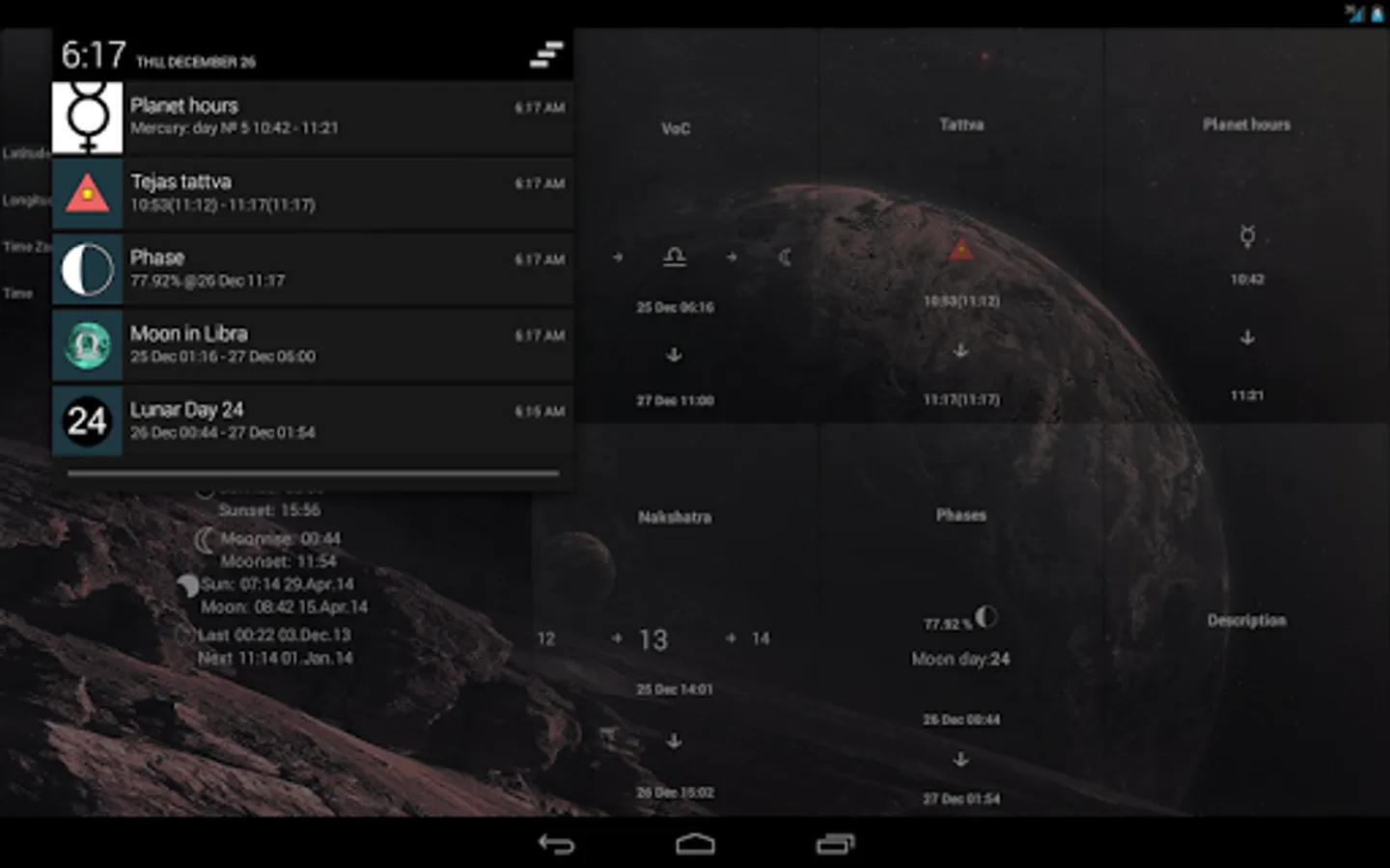 The major feature of Lunar Calendar 2016 is to calculate lunar day for any point of the Earth you want at any time you want. Of course, you can read astrological description and advices for everyday. Now it is supported two variants of lunar days: indian (new day each 12 degrees) and moon rise (new day each moon rise or new moon).