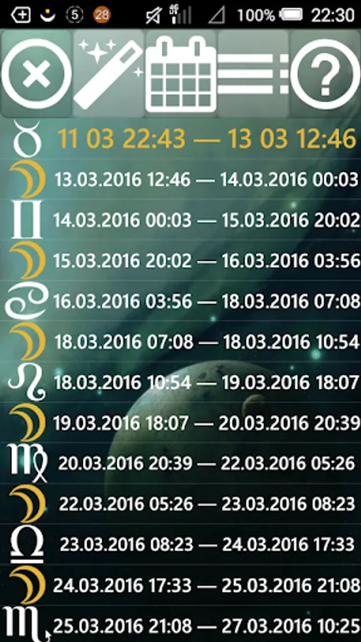 The Moon in Zodiac is available in two variants: list and calendar mode.