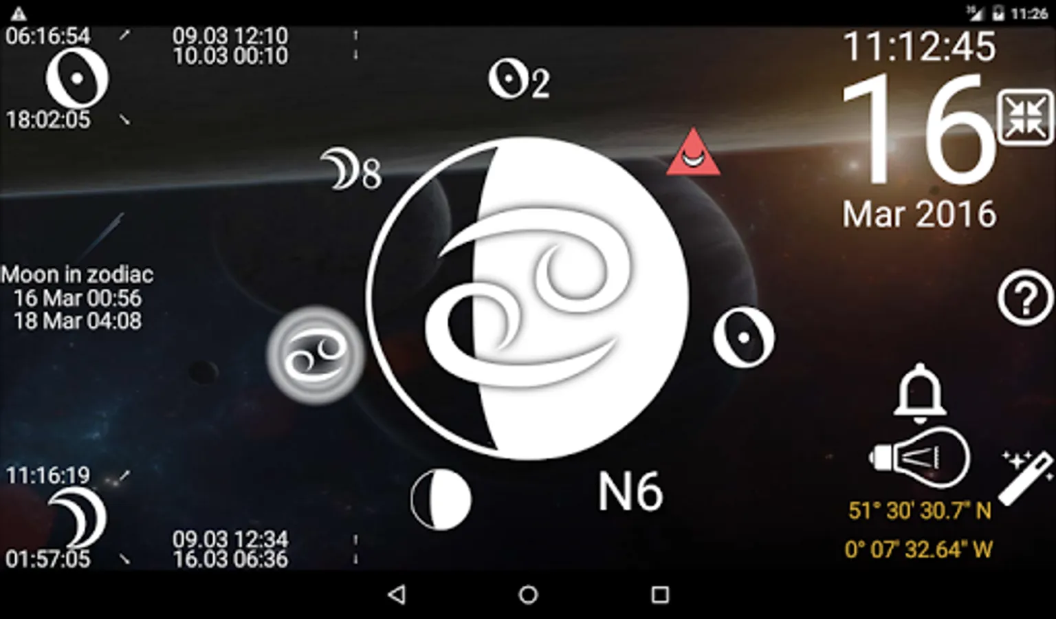 The second major feature is Moon phases: the list of Moon phases, solar eclipses, lunar eclipses. Moon phases are also shown in calendar mode.