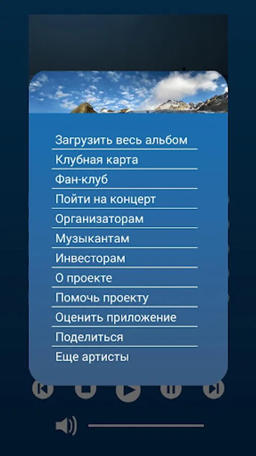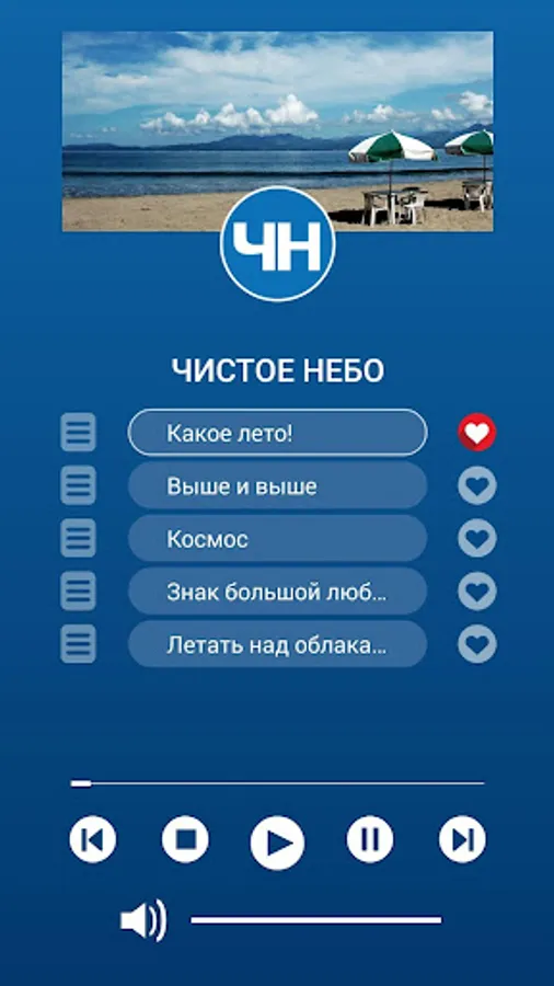 The album of 12 songs Clear Skies! Stylish and convenient music app - player other than the new songs in Russian, available in 1 click on your desktop gadget. Nice design, text, off-line mode options for fans, musicians, event planners, investors, positive music lovers.