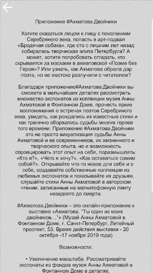 Thanks to the application # Akhmatova.Doubles, you will be able to examine in great detail many exhibits from the collection of the museum of Anna Akhmatova in the Fountain House, read vivid recollections of the meetings of the poets of the Silver Age, see how their famous poems were born and how the fate of many heroes of that time tragically ended. Appendix # Akhmatova. Doubles are not just a visualization of the fate of Anna Akhmatova and her contemporaries, their life and creative experience, but also the opportunity to project this experience on myself, reflect on: “Who am I?”, “What do I want?”, “How to stay myself by yourself? ” Discover something new for yourself and about yourself, create your own collections from your favorite exhibits and show them to friends, listen to Anna Akhmatova’s poetry in the author’s reading, recorded on tape just before death.