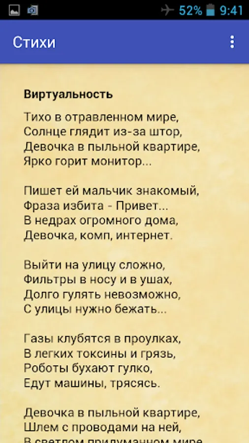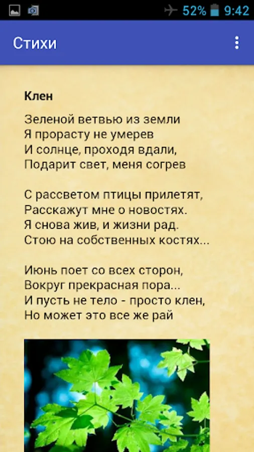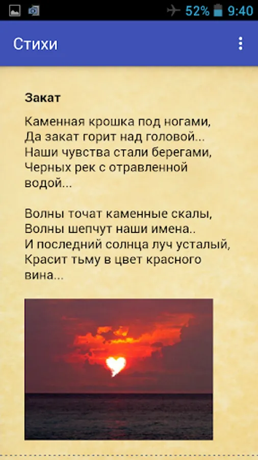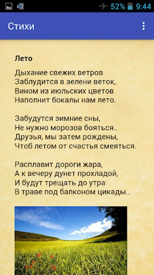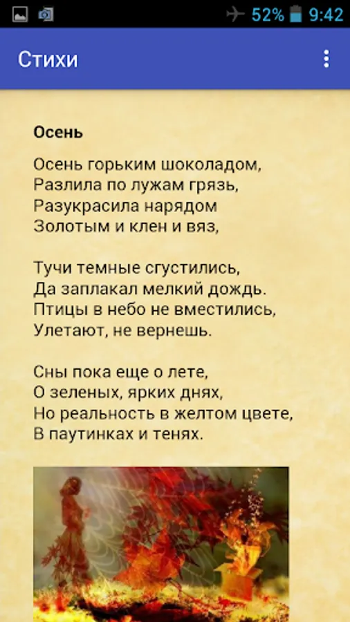 A collection of poems in Russian, with color pictures. The app includes 345 poems, divided into various topics: