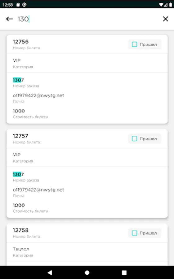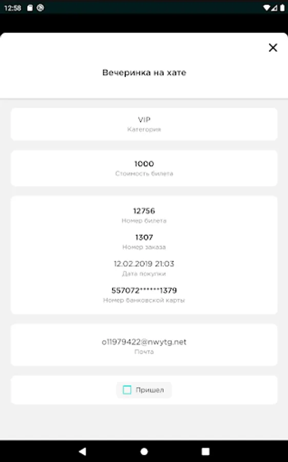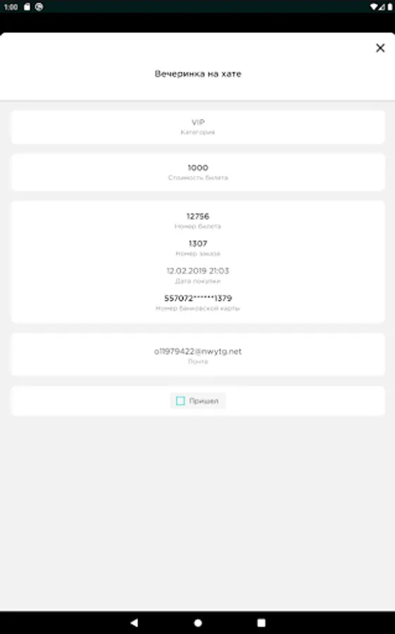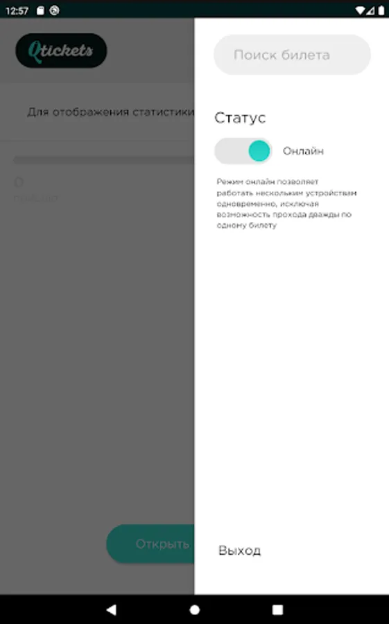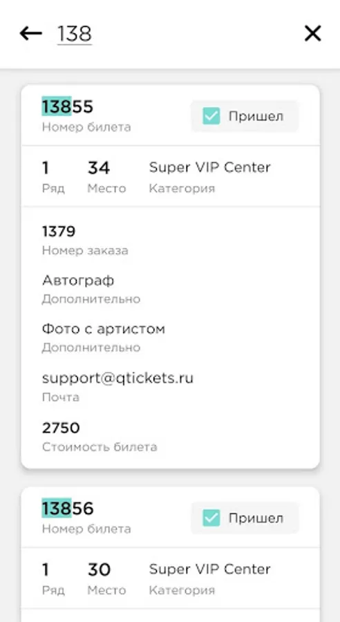 The mobile application allows you to check all tickets. There is no dependence on third-party scanning programs, it works in real time, as well as without the Internet. During scanning, you see statistics on the number of arrived and expected guests, you can find the ticket manually. For cases when the passage can be carried out by guests on their own and without the help of a controller, use a tripod and the mode of operation through the front camera, which will allow you to simply observe the process and intervene only in case of problems with the ticket - the application will emit a sound notification.