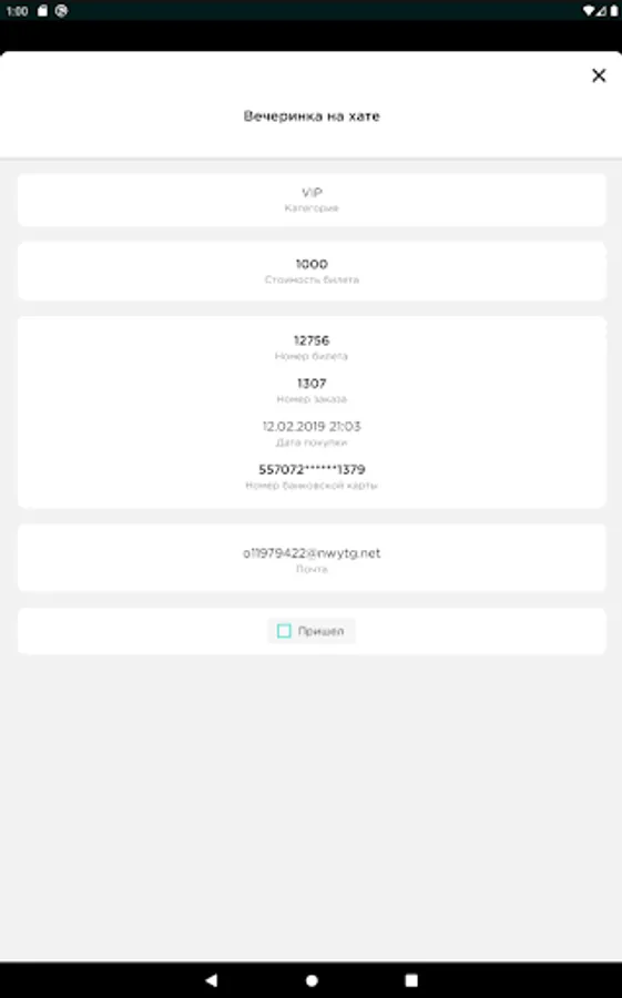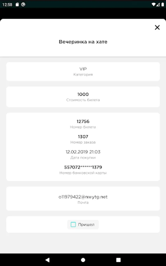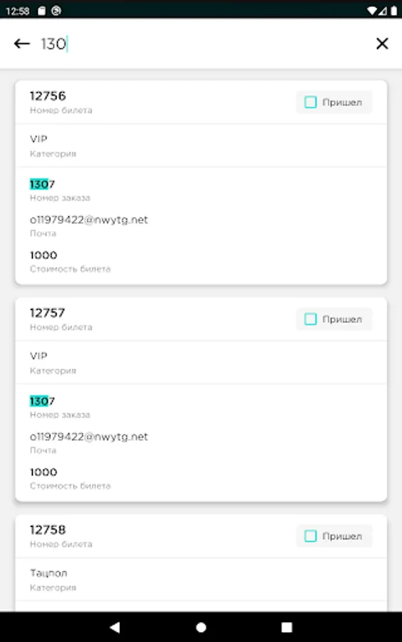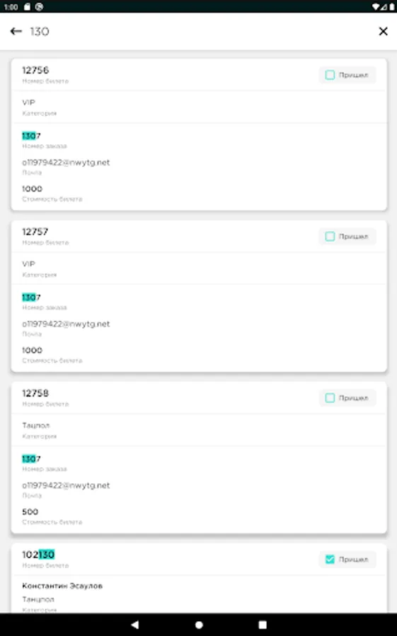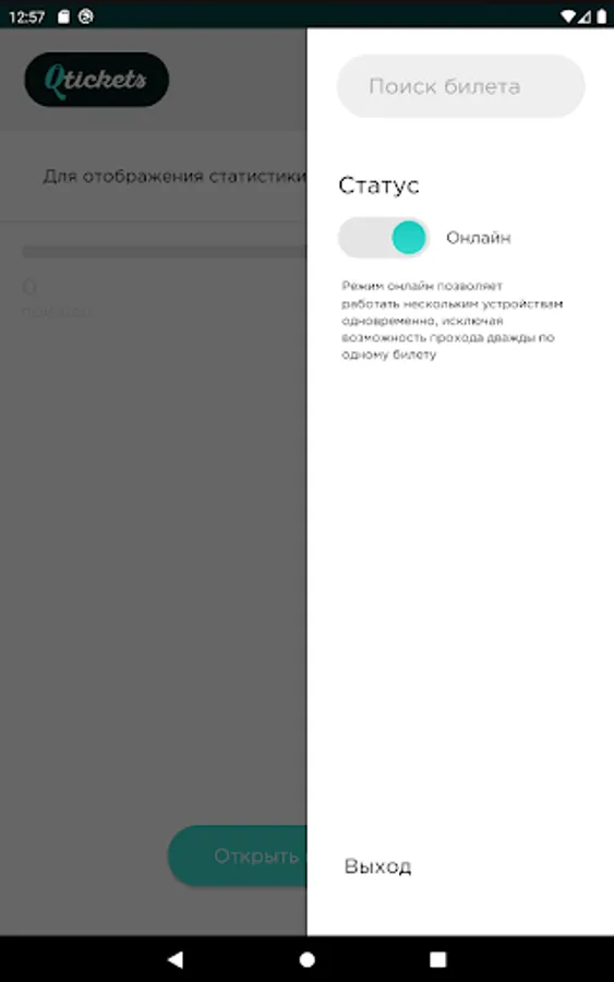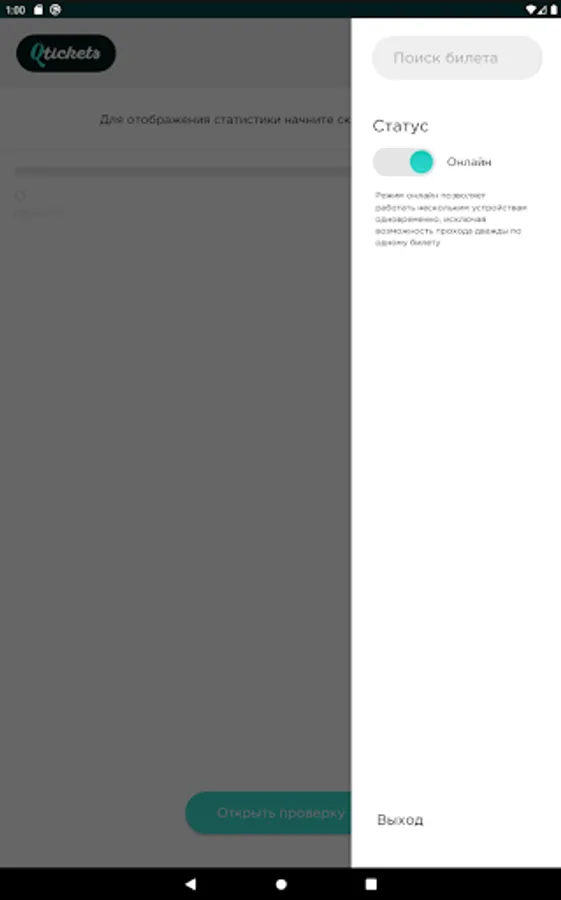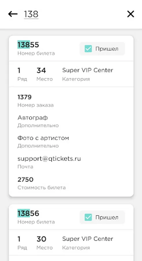 The mobile application allows you to check all tickets. There is no dependence on third-party scanning programs, it works in real time, as well as without the Internet. During the scan, you see statistics on the number of guests who arrived and expected, you can find the ticket manually. For cases where the passage can be carried out by guests independently and without the help of a controller, use a tripod and the operating mode through the front camera, which will allow you to simply monitor the process and intervene only in case of problems with the ticket - the application will issue a sound notification.
