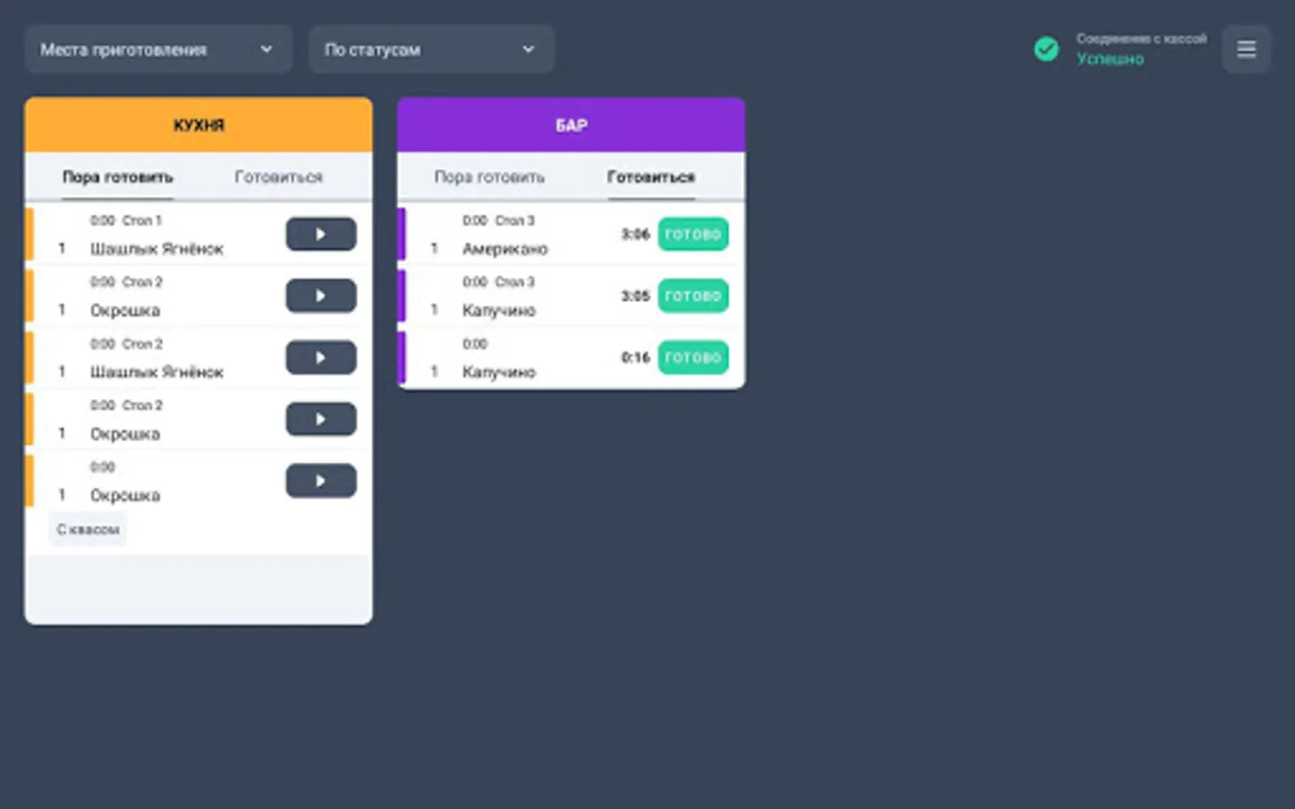 - Notification to the waiter: when the cook marks the readiness, the waiter will receive a sound notification and see the status of the “Ready” dish.