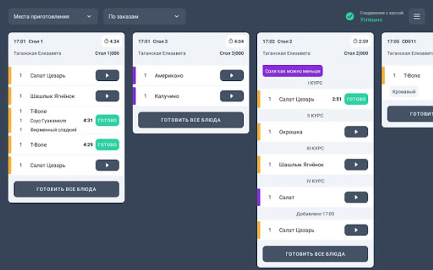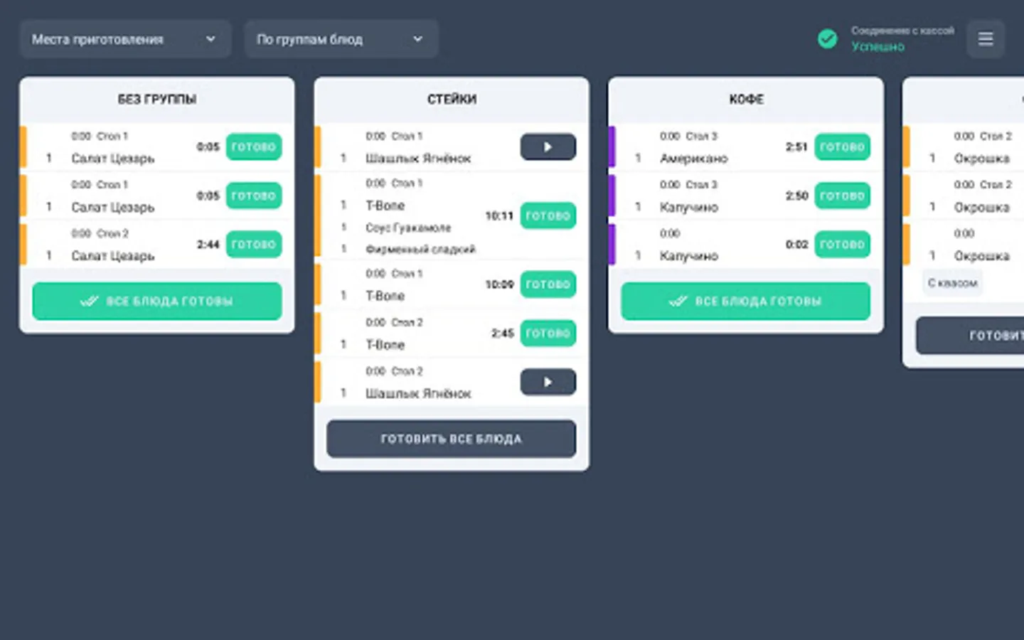 - Operational monitoring of the situation: you can choose the currently convenient presentation of the order queue - by orders, by food groups or by workshops.