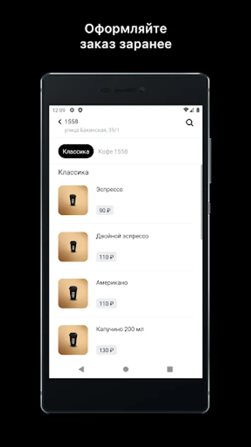 Autokofeyni 1558 application is an opportunity to select the items you like in the menu and pay for your order with a few taps right from the phone screen and drive up to the order issue window in your car.