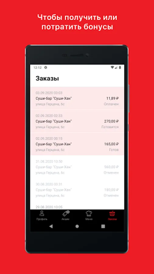 With the mobile application "Sushi Khan" became even closer to regular guests and is always glad to new ones. With it you can: