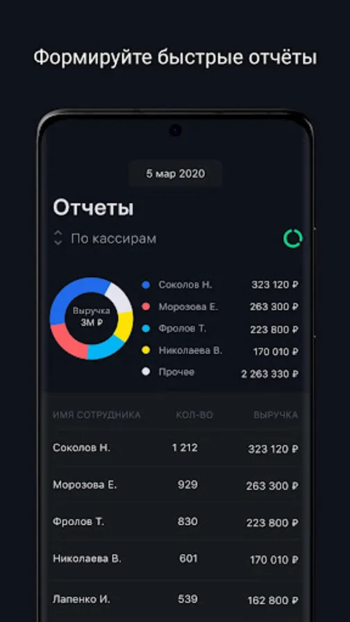- Reports: which dishes were bought most, which of the waiters sold better, how the guests paid (by card, cash, bonuses).