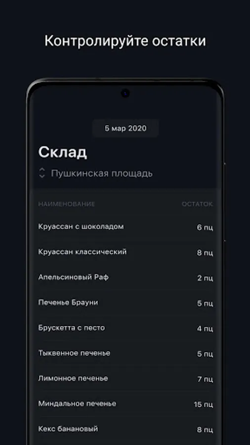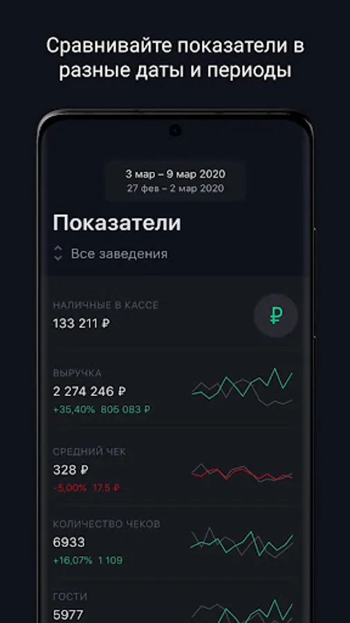 - All important indicators in the form of graphs: revenue, profit, average check, number of guests and number of checks. Watch them in dynamics for the selected periods.