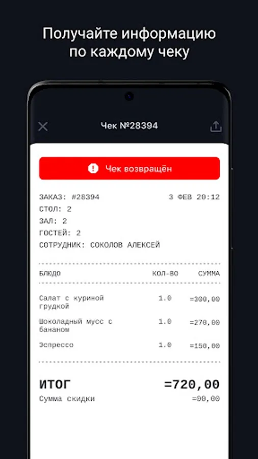 - Full information for each check: number of guests, order details, name of the waiter, discount amount, cancellation of a bill, and more.