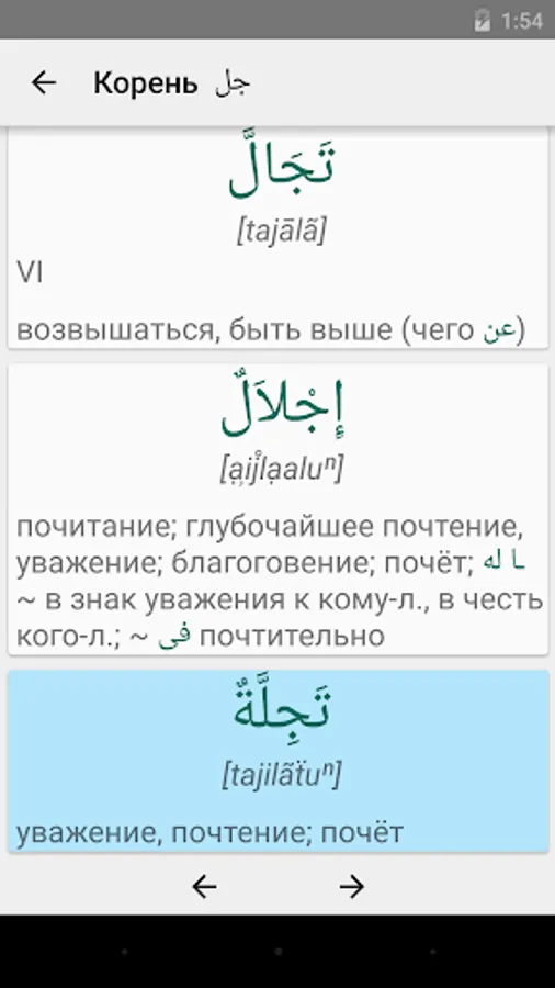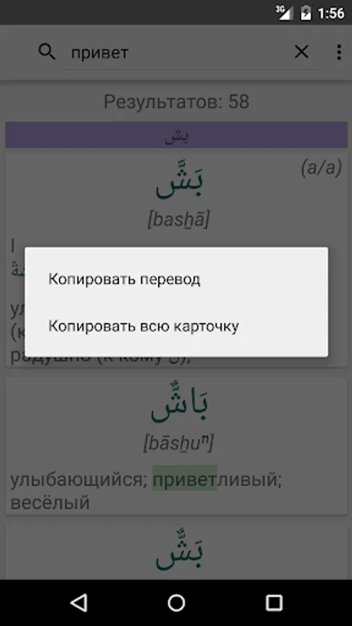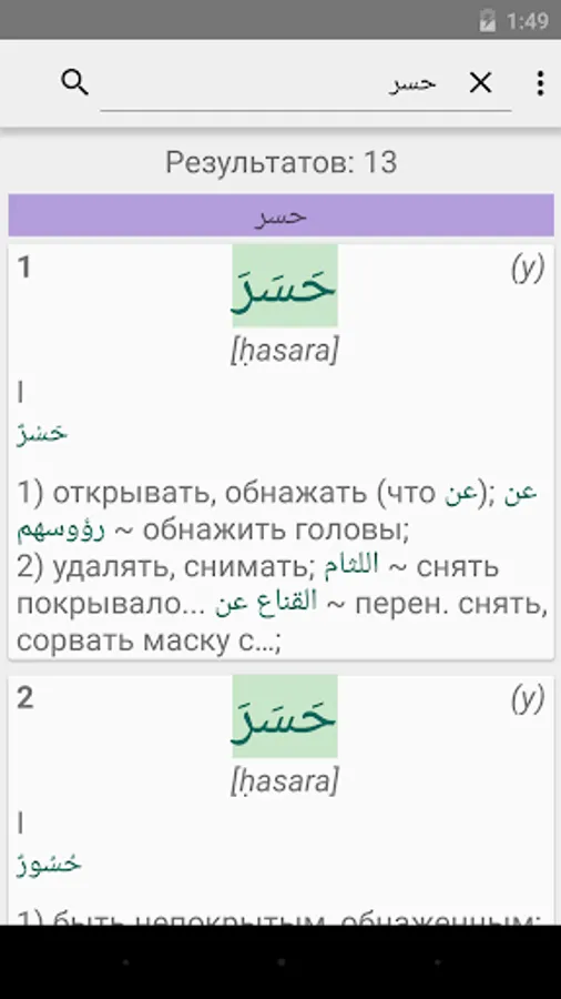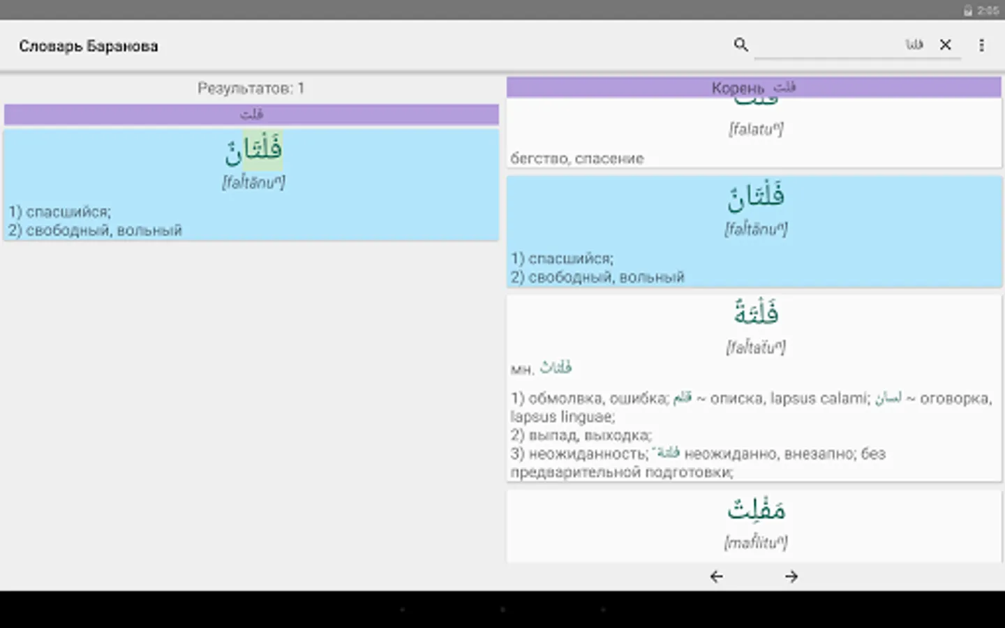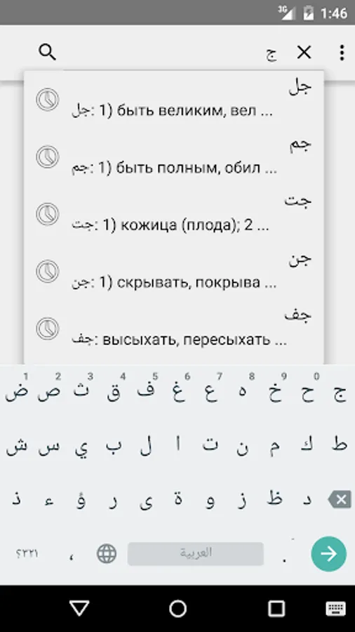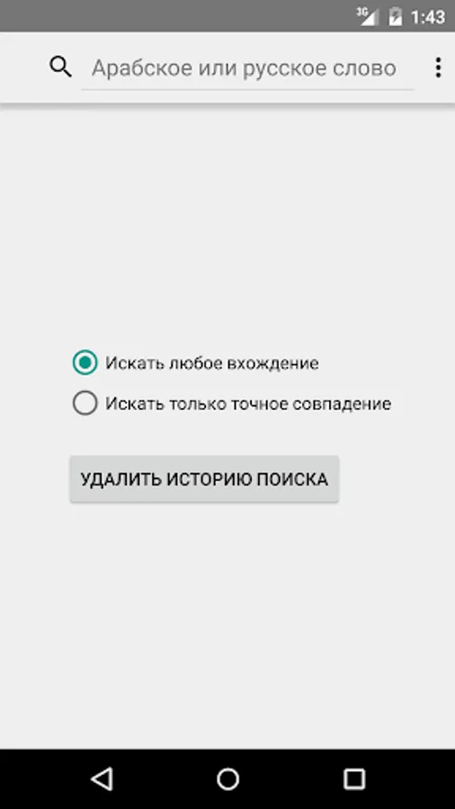 * Flexible search: You can search for parts of words, you can specify exact match mode. Both modes work with the search for both Arab and Russian words. In the search results for all matches are highlighted. Search results sorted by relevance.