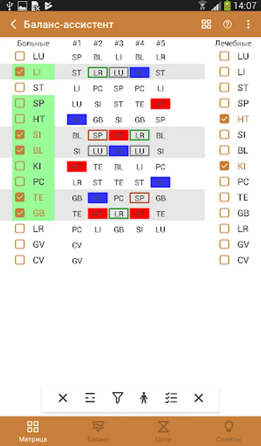 - Balance Assistant - a dynamic matrix that helps to choose balancing meridians;