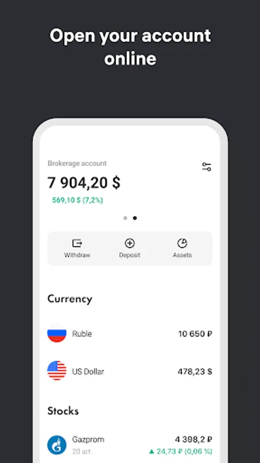 This user-friendly mobile app is a convenient way to invest in stocks, bonds, funds, and currencies from your mobile phone. It provides online access to the stock market and thousands of securities, and moreover, access to 10 000 professional instruments for qualified investors.