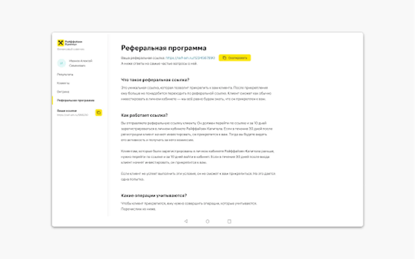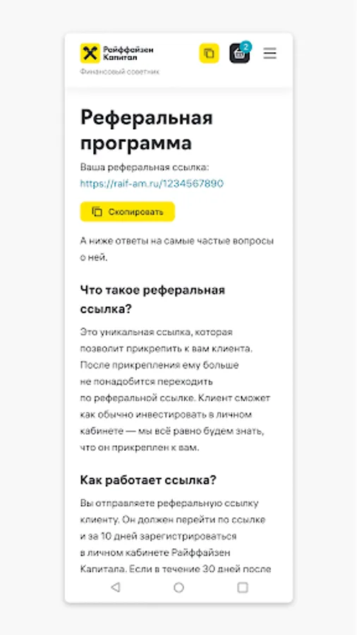 - Send your referral link to your clients - with the help of it, clients will be assigned to you and you will see their investments in Raiffeisen Capital funds and strategies