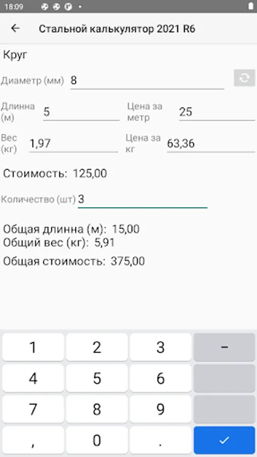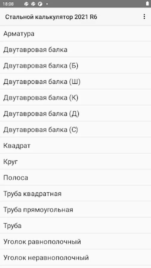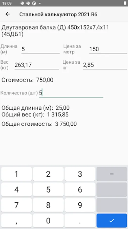 The rolled metal calculator allows you to calculate the mass and length of round and profile pipes, angle bars, channel bars, beams, strips, steel reinforcement of various sizes. The program includes a standard assortment of rolled metal (angle, profile pipe, I-beam, channel, fittings).