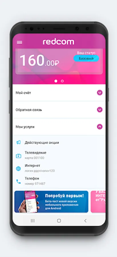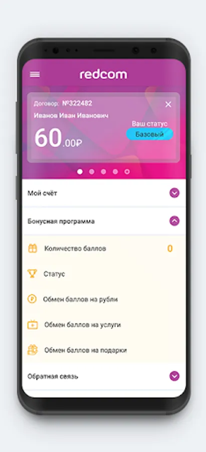 The Redcom application will allow you to manage contracts, replenish accounts, accumulate and exchange points.