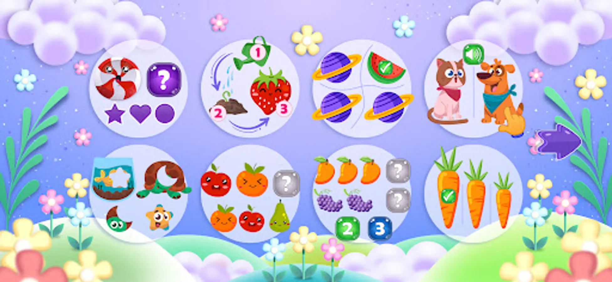 Our application presents 16 educational games, diverse and exciting, each of which is specially designed to help your child learn various aspects of the world around them. Our application offers your child the opportunity to learn numbers, shapes, names of animals, fruits and vegetables, develop logical thinking and improve mental skills.
