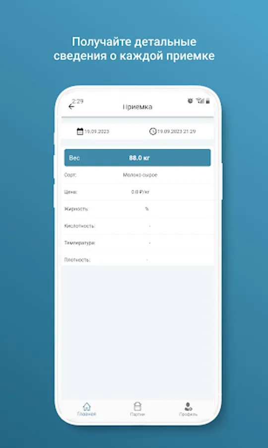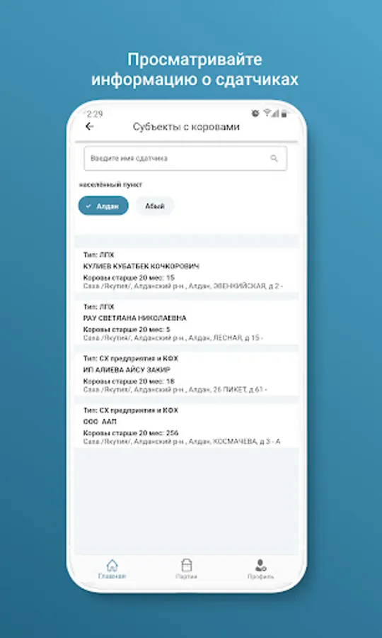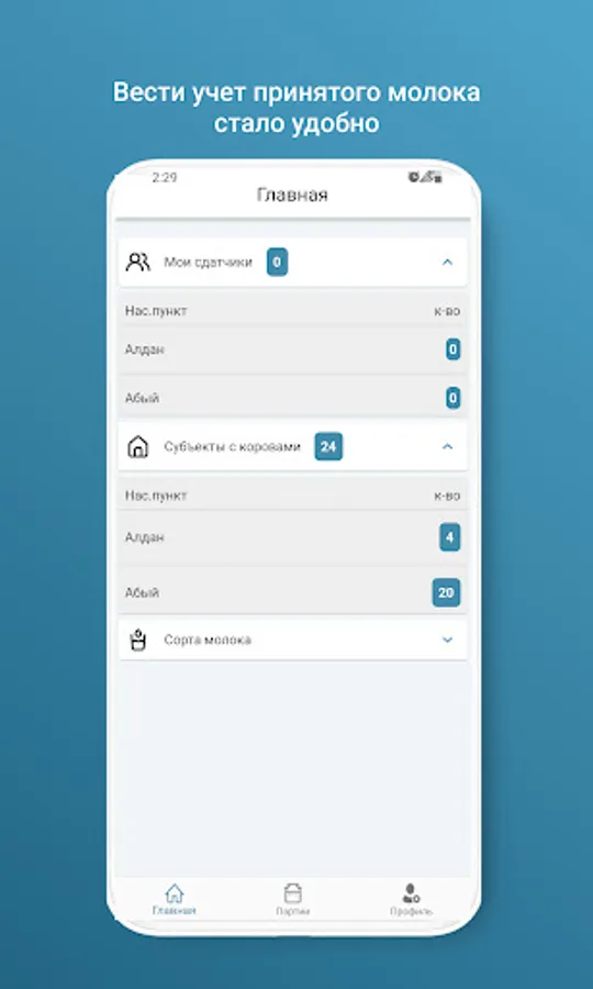 The application is intended for employees of the milk collection point (receivers) who supply batches of milk to a procurement organization (dairy plant), and are responsible for the acceptance and registration of batches of milk received from donors. This application helps receivers keep records of received milk, add and view information about the quantity and quality of milk delivered, in the context of each private household plot - a member of the cooperative or private household plot with whom an agreement for the delivery of milk is concluded, receive data about the donors, including information about the number of older cows they own. 20 months from the “Automated system for accounting and registration of farm animals “REGAGRO””. And also receive data from the dairy plant, including calculation of the purchase price, the results of milk quality studies, which the Laboratory Assistant enters into laboratory journals daily, information about the control sample from individual donors.