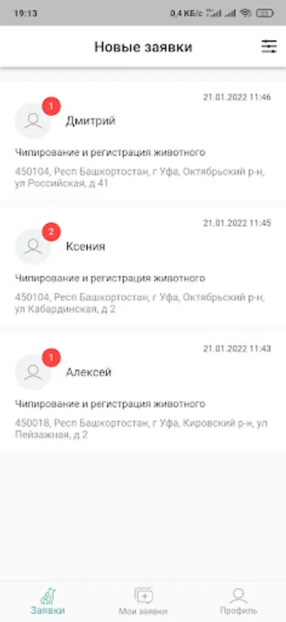The application makes it possible to receive applications for registration of animals in real time, select suitable applications and confirm their implementation. Applications contain information that allows the veterinarian to choose the most suitable one, taking into account the location of the animal and the urgency of providing the service, and agree with the owner on the date and time of the visit.
