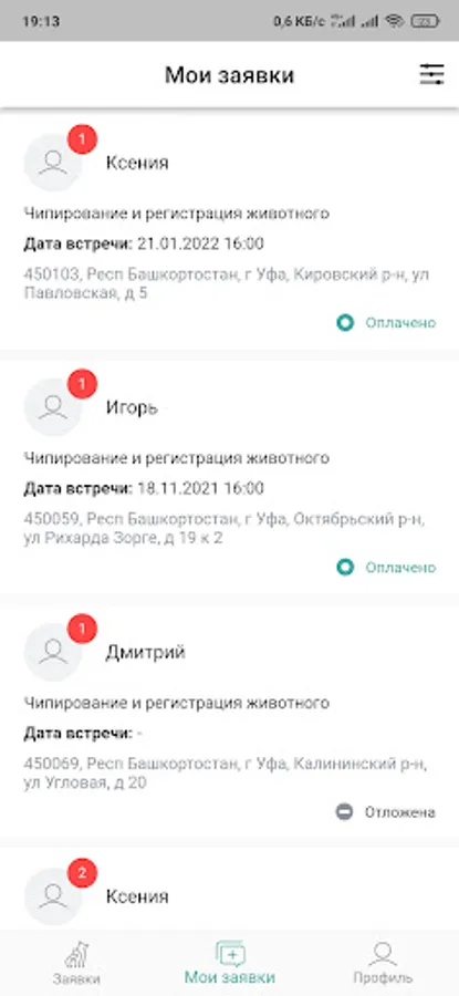 The selection of applications for the provision of the service is carried out using a map, which displays the location (addresses) of the owners of animals who have applied for registration of a pet at home. The application allows you to get directions to the selected address and determine the travel time.
