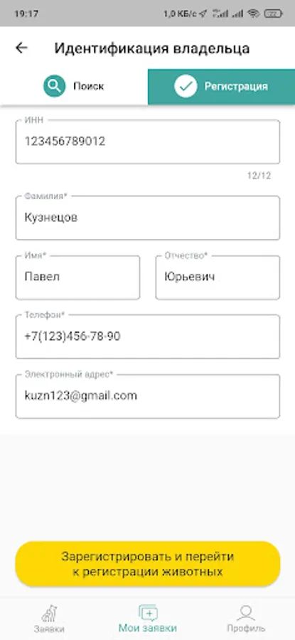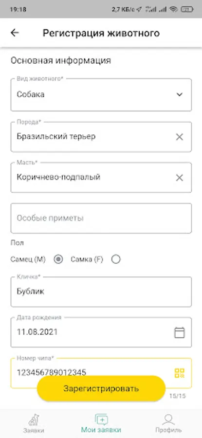 A mobile application for specialists of the state veterinary service (veterinarians and paramedics) who want to provide services to pet owners to register their pets at home. As a result of registration, which implies the preliminary chipping of the animal, information appears in the state system of accounting and registration of domestic animals that allows the animal to be accurately identified and to establish its belonging to a specific owner.