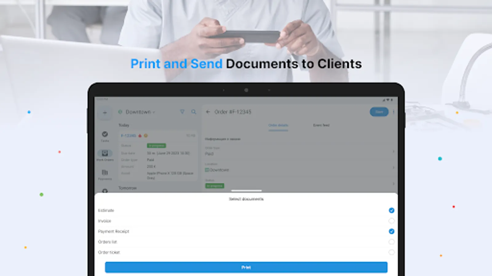Work Orders App is an application for field workers and mobile teams that offer contractor, auto, electronic, computer repair and maintenance services on-site. There is a two-way synchronization between the cloud-based software RemOnline and the Work Order App — updates you make via the app appear instantly in the web version and vice versa. This intuitive app is free for all RemOnline users with an active subscription.