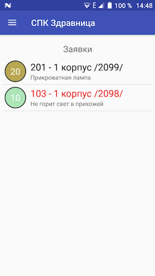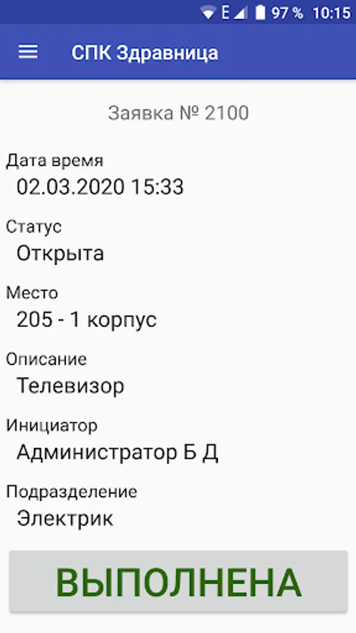 Notification for staff about the arrival of a new application. Viewing information about the request, initiator, place of execution, description of the malfunction.