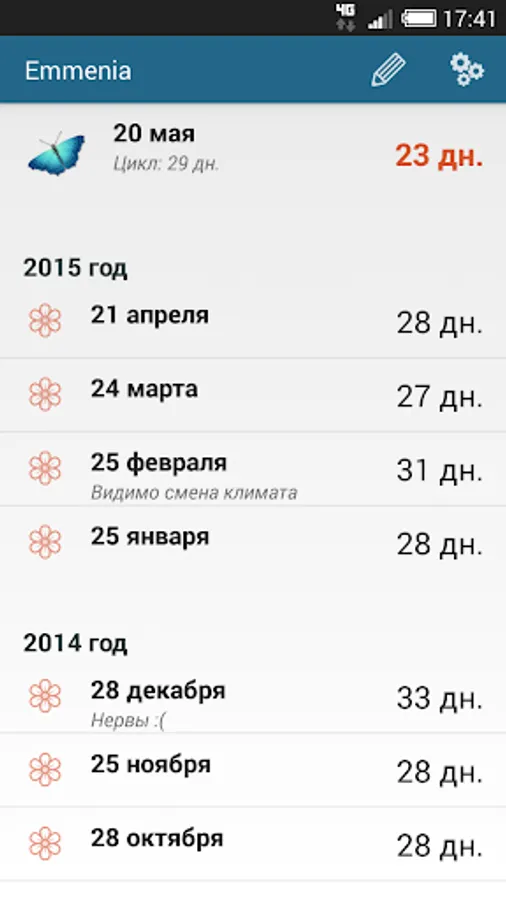 Emmenia - a simple calendar for women. Celebrate the first day of the month, the program will automatically calculate your cycle and suggest the following dates.