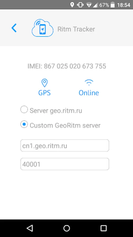 Ritm Tracker has a minimal interface in which only the address for connecting to the monitoring system server and the connection status are indicated. All observation of the object comes from the web interface or the GeoRitm mobile application.
